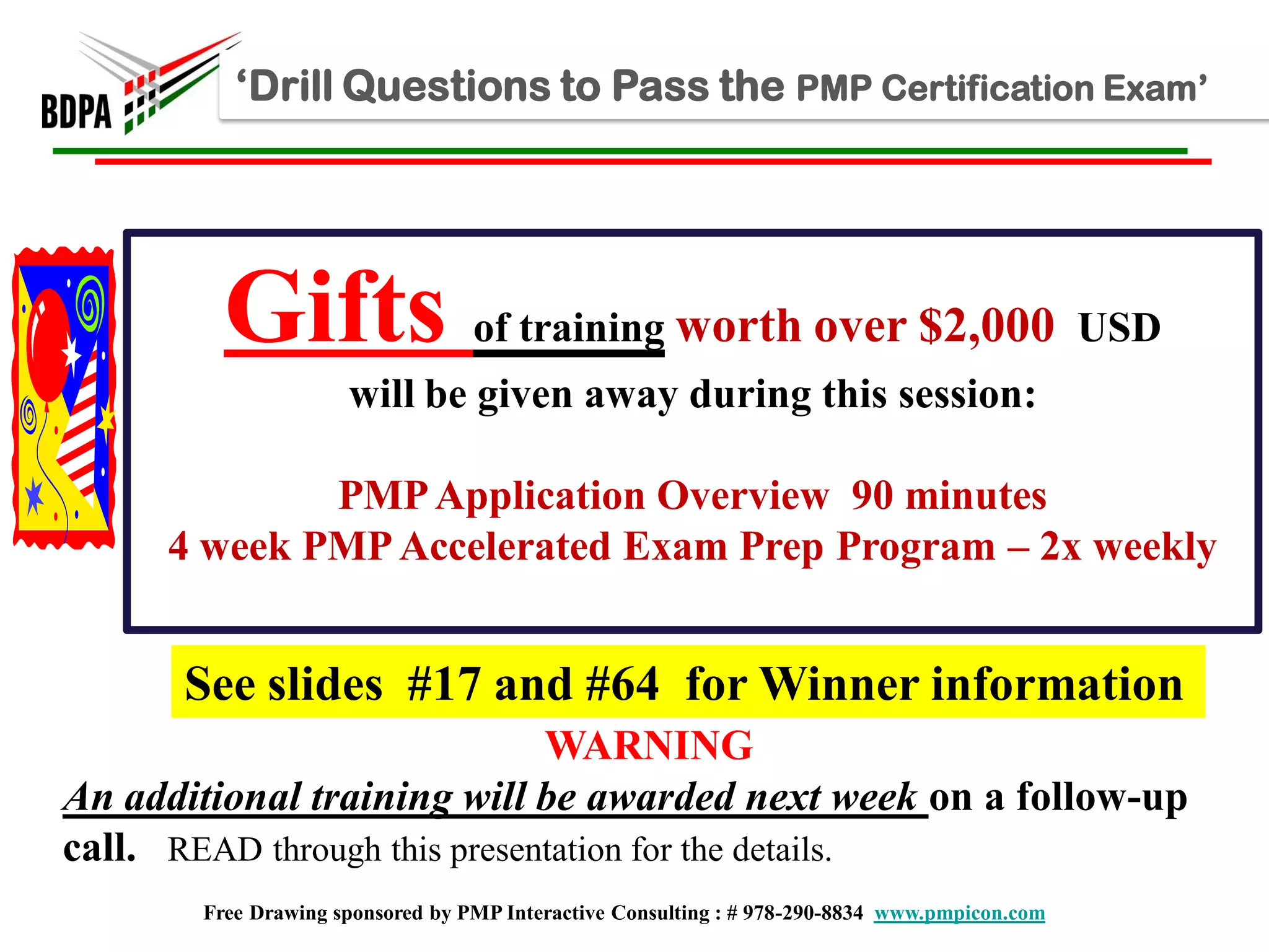 - The document is a slide deck from a presentation on preparing for the PMP certification exam. It provides study materials, sample exam questions, and information on prizes being given away during the session.