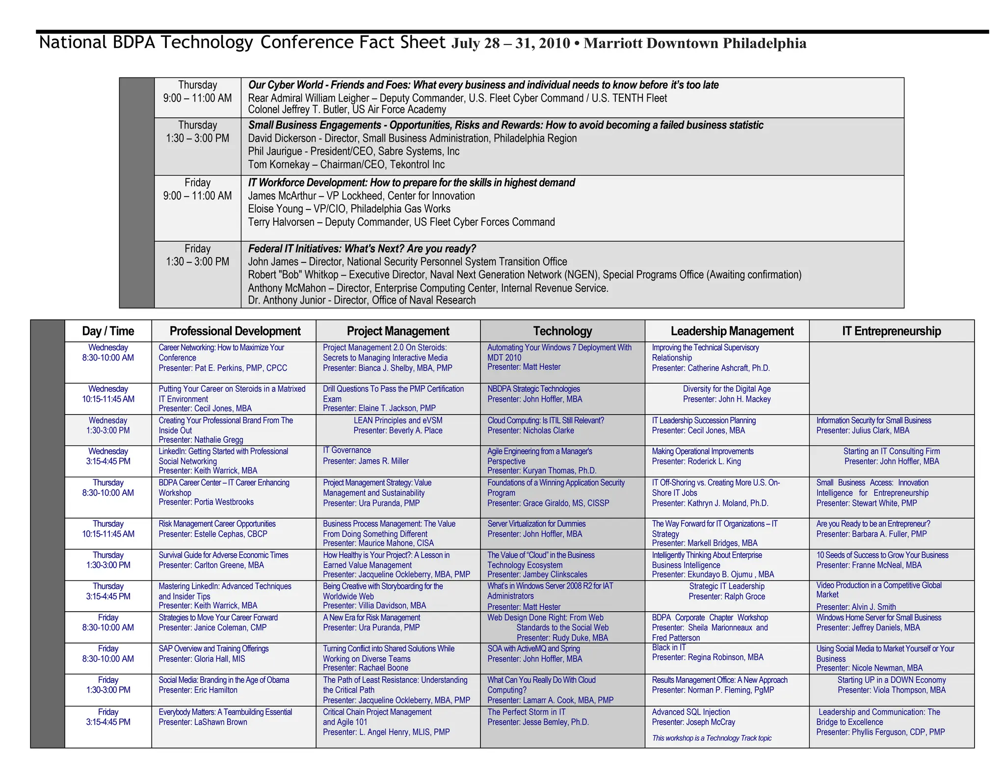 Thursday                        BDPA Career Center – IT Career Enhancing        Project Management Strategy: Value              Foundations of a Winning Application Security   IT Off-Shoring vs Creating More U.S. On-    Small Business Access: Innovation