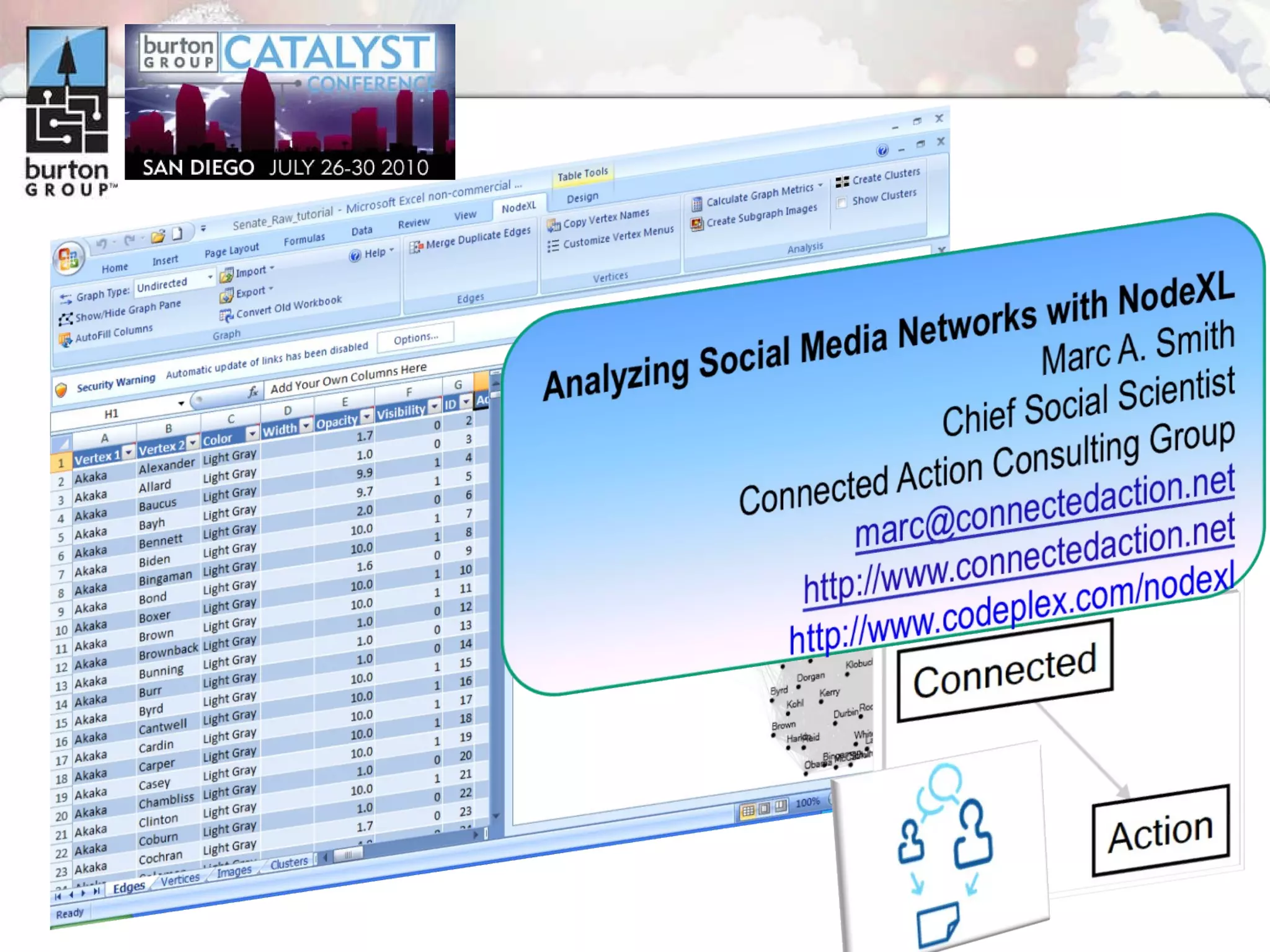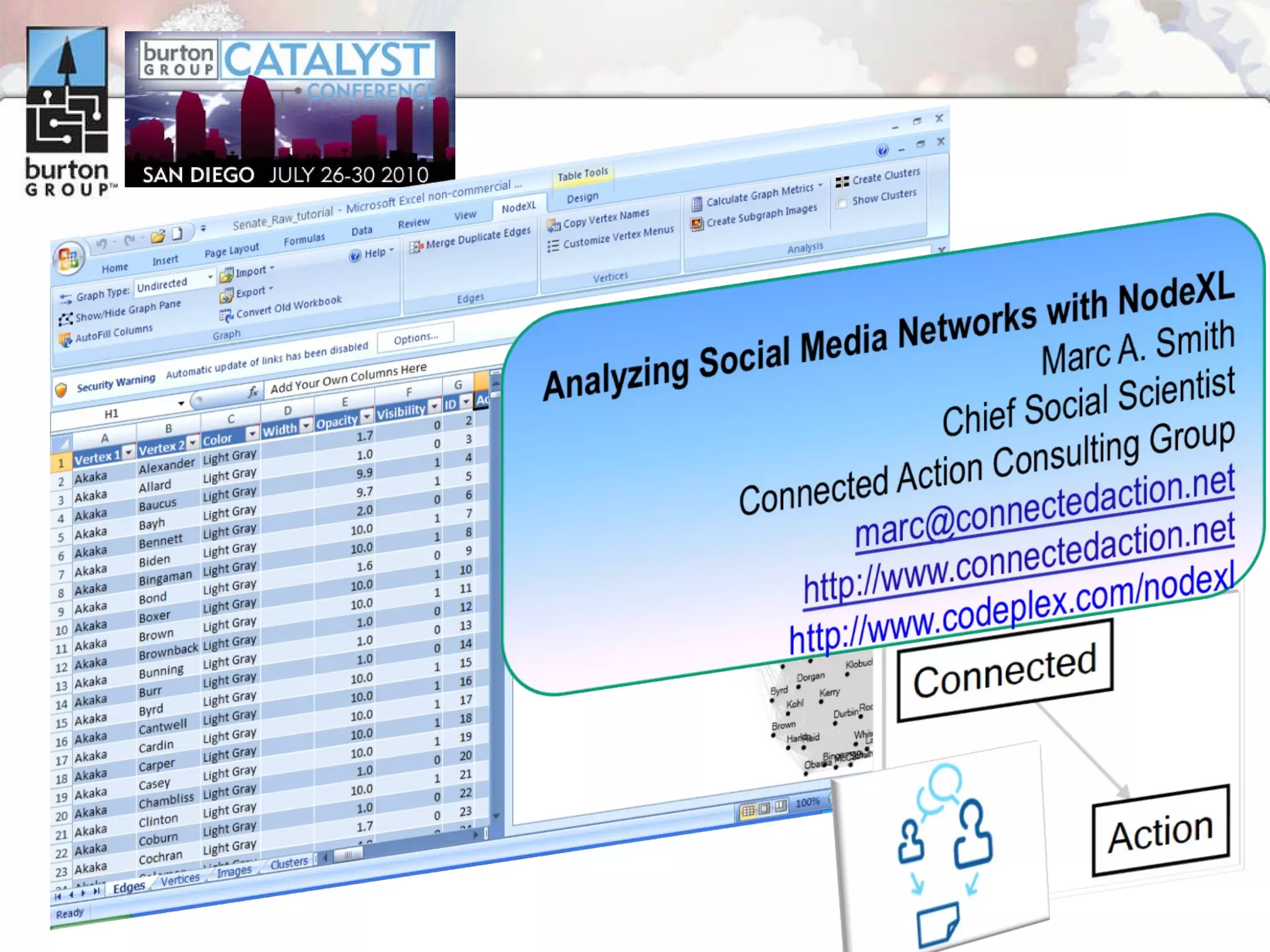 The document discusses trends in social networking and social network analysis (SNA) led by Dr. Marc A. Smith, highlighting his background and the Connected Action Consulting Group's focus on applying social science methods to social media. Key topics include the implications of SNA for IT organizations, privacy risks, and case studies on various social media platforms. It also outlines a tutorial for analyzing social media networks using the NodeXL tool, and anticipates future implications with the rise of social media data.