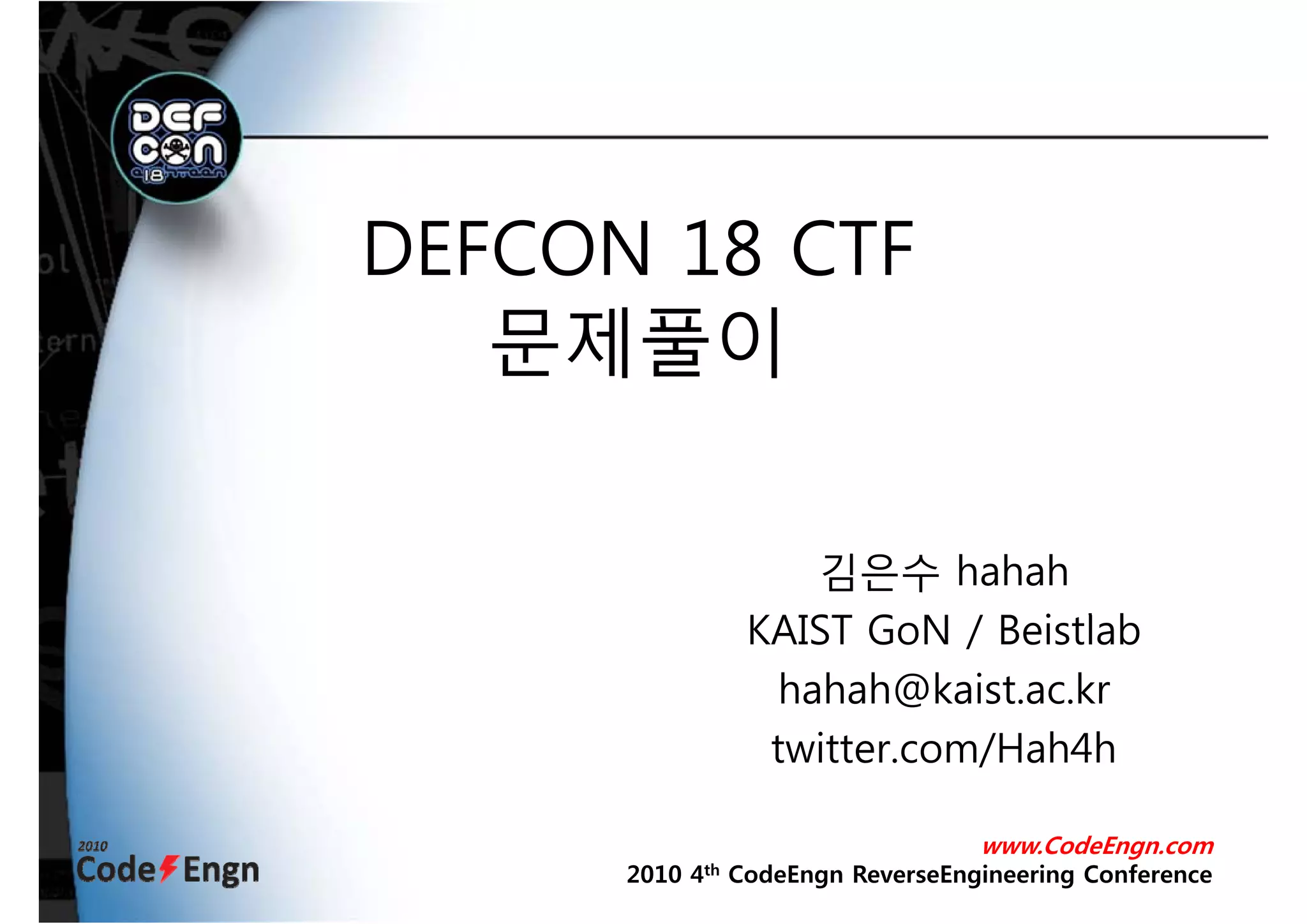 2010년 5월 22~24일, 세계 최대의 해커들의 축제인 DEFCON 18의 CTF 예선이 열렸습니다. Kaist 보안동아리 GoN 팀으로 참여하면서 느낀 이번 DEFCON CTF 예선에 대한 전반적인 리뷰와 함께, 여러 문제 분야들 중 Binary l33tness, Pwtent pwnables 분야의 문제들의 풀이를 해보고자 한다. (Defcon 18 CTF 예선전 전체 529팀에서 6위로 본선진출)