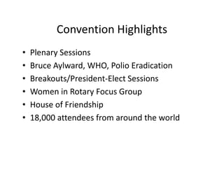 Bruce Aylward, the director of the WHO's Polio Eradication Initiative, spoke at the 2010 Rotary International Convention in Montreal. He discussed the near-eradication of polio and the critical importance of fully eliminating the disease. The cost of the global polio eradication program is 24 cents per child vaccinated, and for just 10 more cents, each child is also receiving immunizations against measles and other diseases. Failing to eradicate polio could lead to over 1 million more children being infected by the disease. The convention also featured discussions on Rotary's goals and programs, as well as networking opportunities for Rotarians from around the world.