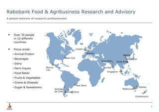 This document discusses opportunities for Chile in the global food market. It provides an overview of Rabobank's global food and agribusiness research network, which has over 70 professionals in 12 countries focusing on various commodities and industries. It then examines trends in the global economy, agriculture, and emerging markets like Brazil, China, and India that are driving increased worldwide demand for food. The document concludes by suggesting Chile can position itself to capitalize on this growing global food demand.