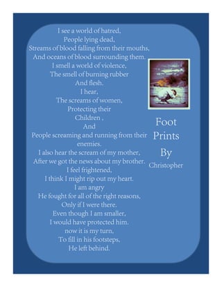 This document is an introduction to an anthology of ecphrasis poetry written by 6th grade students at Newtown Friends School about the Israel-Palestine conflict. Ecphrasis poetry describes works of art, and the students each wrote poems responding to photographs related to the conflict. The introduction provides background on ecphrasis poetry and explains that the students studied the history of the conflict before choosing photographs and writing original poems from different perspectives. The document then shares several of the students' ecphrasis poems responding to and interpreting the photographs.
