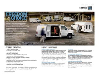 The document details the Ford e-series vans, highlighting their strength, versatility, and broad range of configurations for various trades and organizational needs. It emphasizes features like high towing capacity, flexible fuel options, and advanced technology integrations such as Ford Work Solutions for improved productivity. E-series vans are noted for their robust construction and options for customization to meet diverse business requirements.