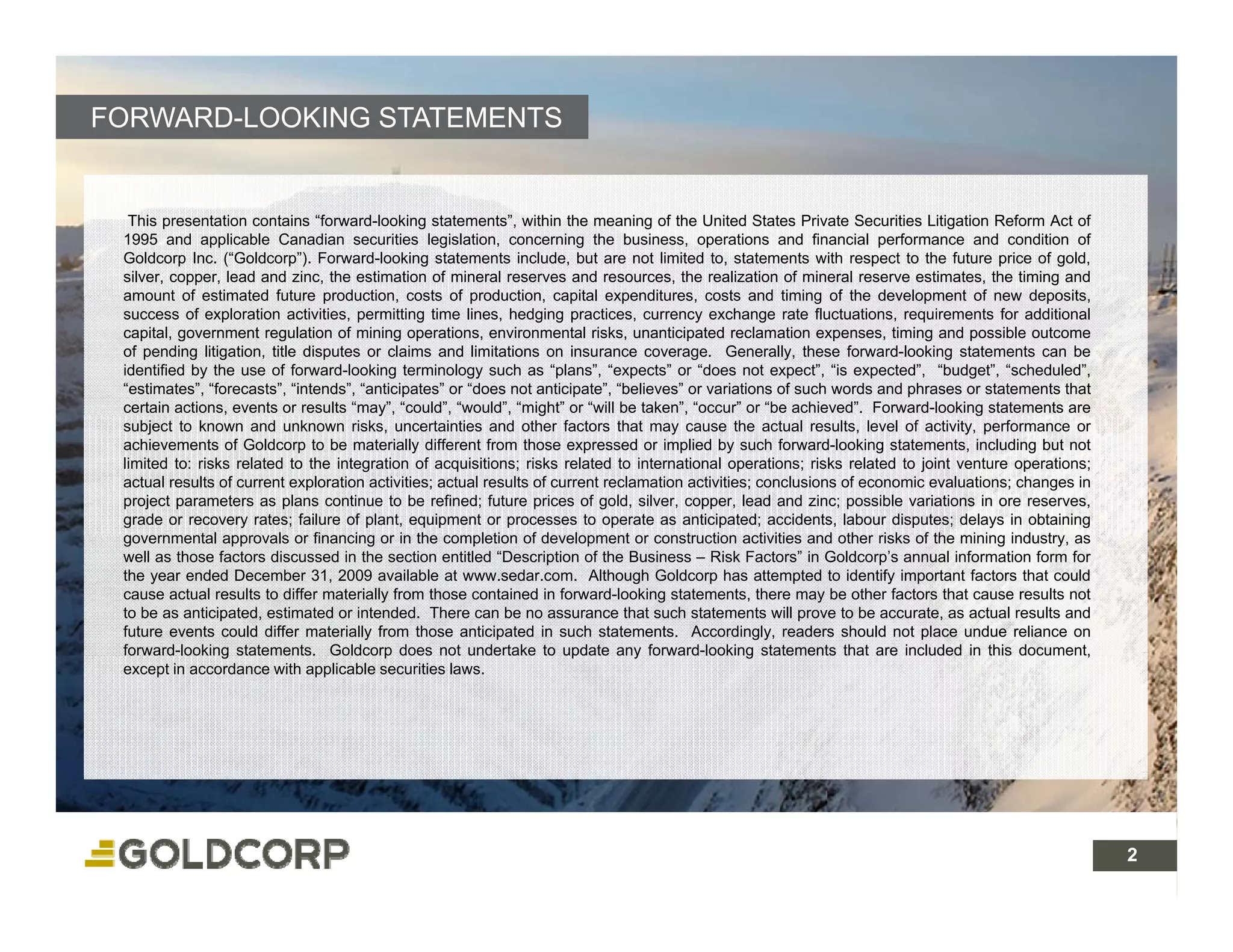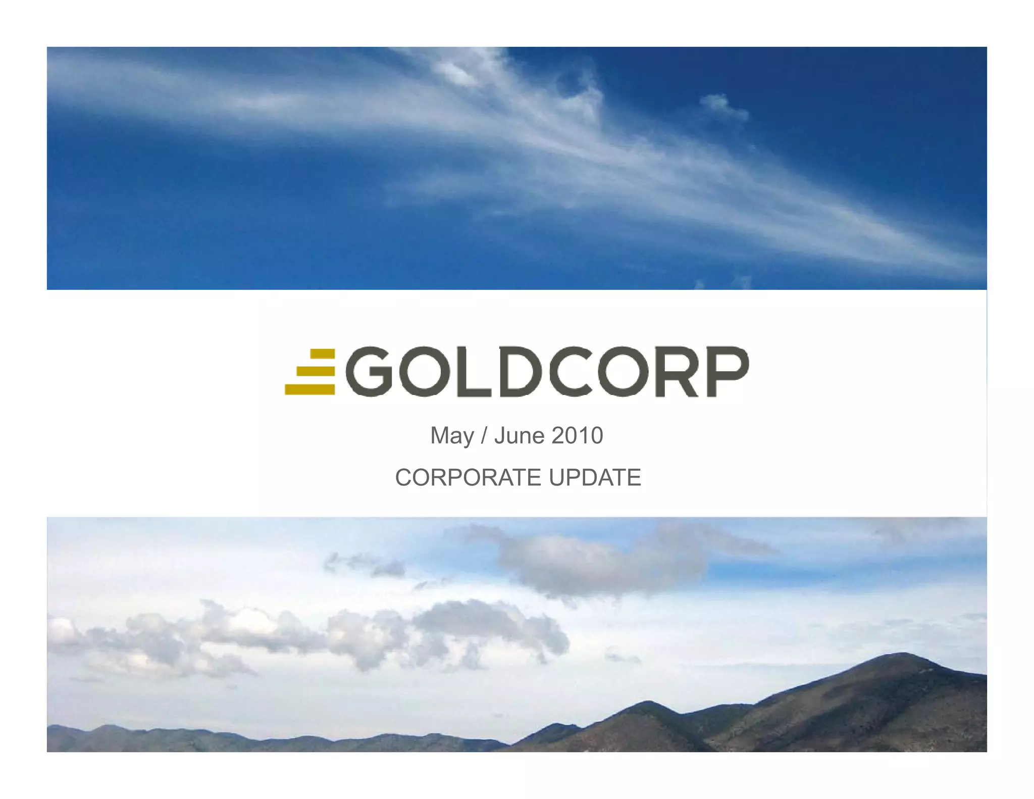 Goldcorp provides a corporate update and guidance for 2010. The company achieved strong earnings and cash flow growth from 2007 to 2009 and expects production to increase to 2.6 million ounces in 2010. Goldcorp has a robust pipeline of projects, with its Peñasquito mine in Mexico being one of the largest new gold mines in the world. The company maintains a strong balance sheet and low-cost production profile. Goldcorp's priorities for 2010 include achieving production at Peñasquito and advancing its pipeline of projects.