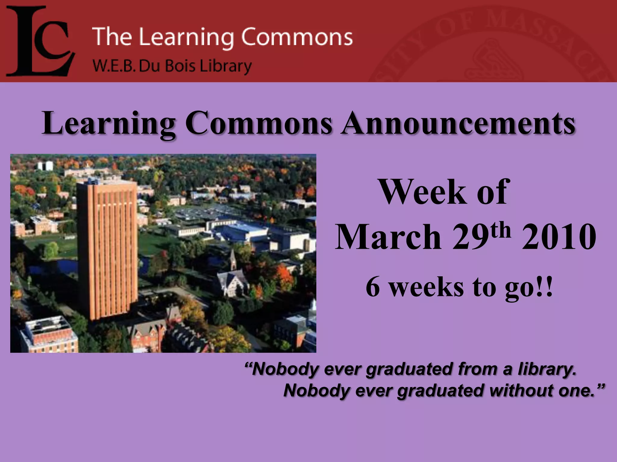 The document provides announcements for the week of March 29th 2010 at the UMass Amherst Learning Commons. It notes that there are only 6 weeks left in the semester and encourages students to make use of the library. It also announces renovations that expanded the Learning Commons.