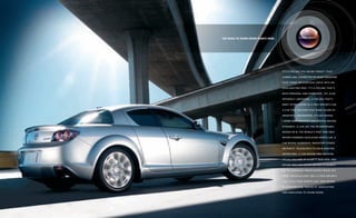The document presents a comprehensive overview of the Mazda RX-8, emphasizing its unique rotary engine, sports car performance, and innovative design features like the freestyle door system that allows easy access for rear-seat passengers. It highlights the vehicle's engineering, driving dynamics, and advanced technology that contribute to its exhilarating experience, as well as Mazda's commitment to motorsports and the development of driver talent. The summary also includes details about the RX-8's specifications, safety features, and customer service offerings.
