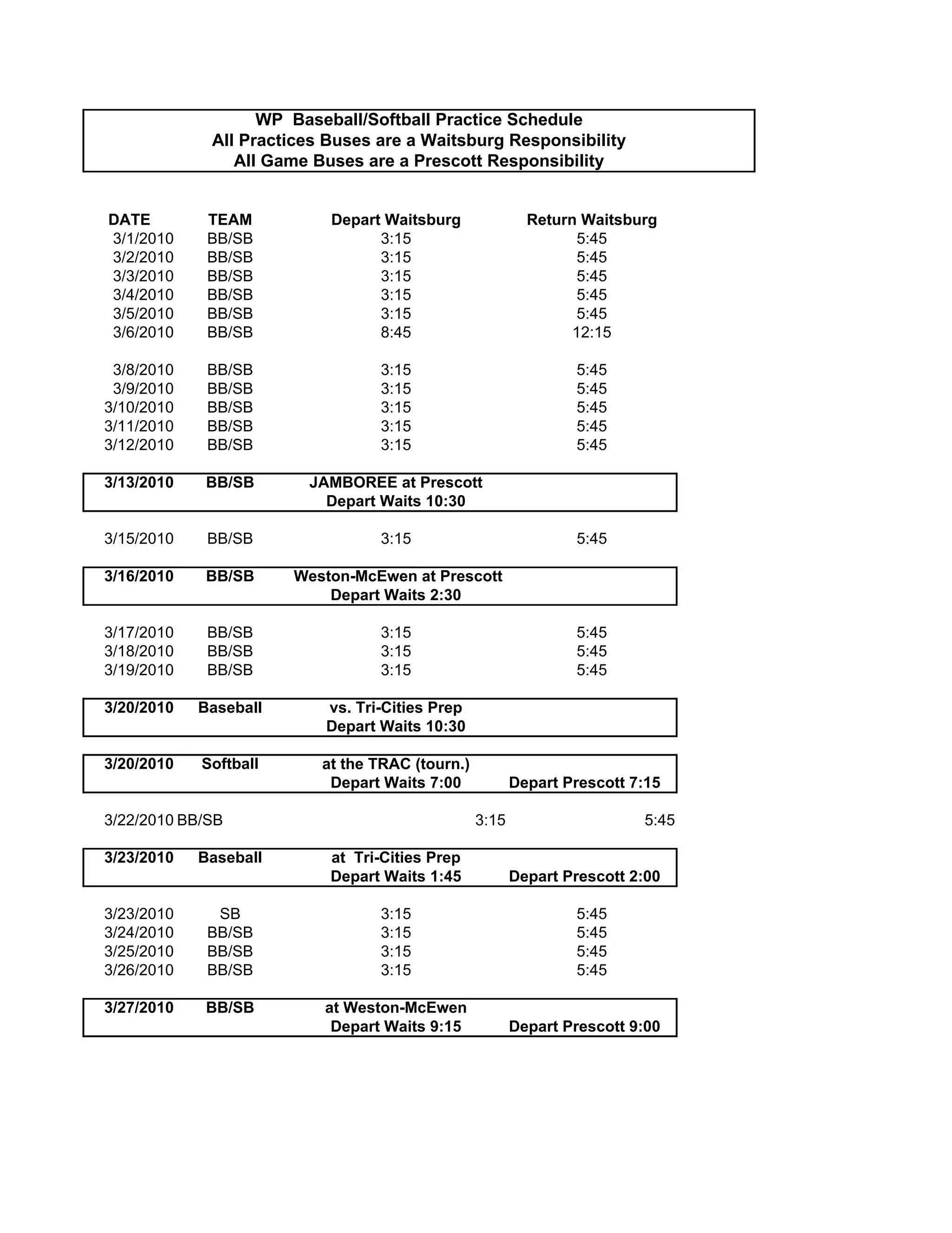 This document outlines the practice and game schedules for the Waitsburg High School baseball and softball teams between March and May. It notes that Waitsburg is responsible for providing buses for all practices, while Prescott is responsible for buses for all games. The schedule lists the dates, teams, and departure/return times for practices and away games.
