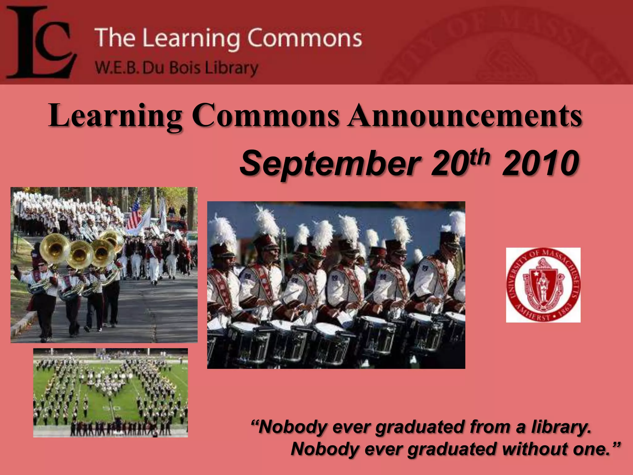 The Learning Commons announcements provide information about new and expanded services available at the library including a new Circulation/Reserves desk, streaming video collections, study abroad and exhibit information. New services highlighted include poster printing, remote printing, research guides, writing and academic advising assistance, tutoring resources and quiet study spaces. Copyright education is emphasized including potential penalties for infringement.