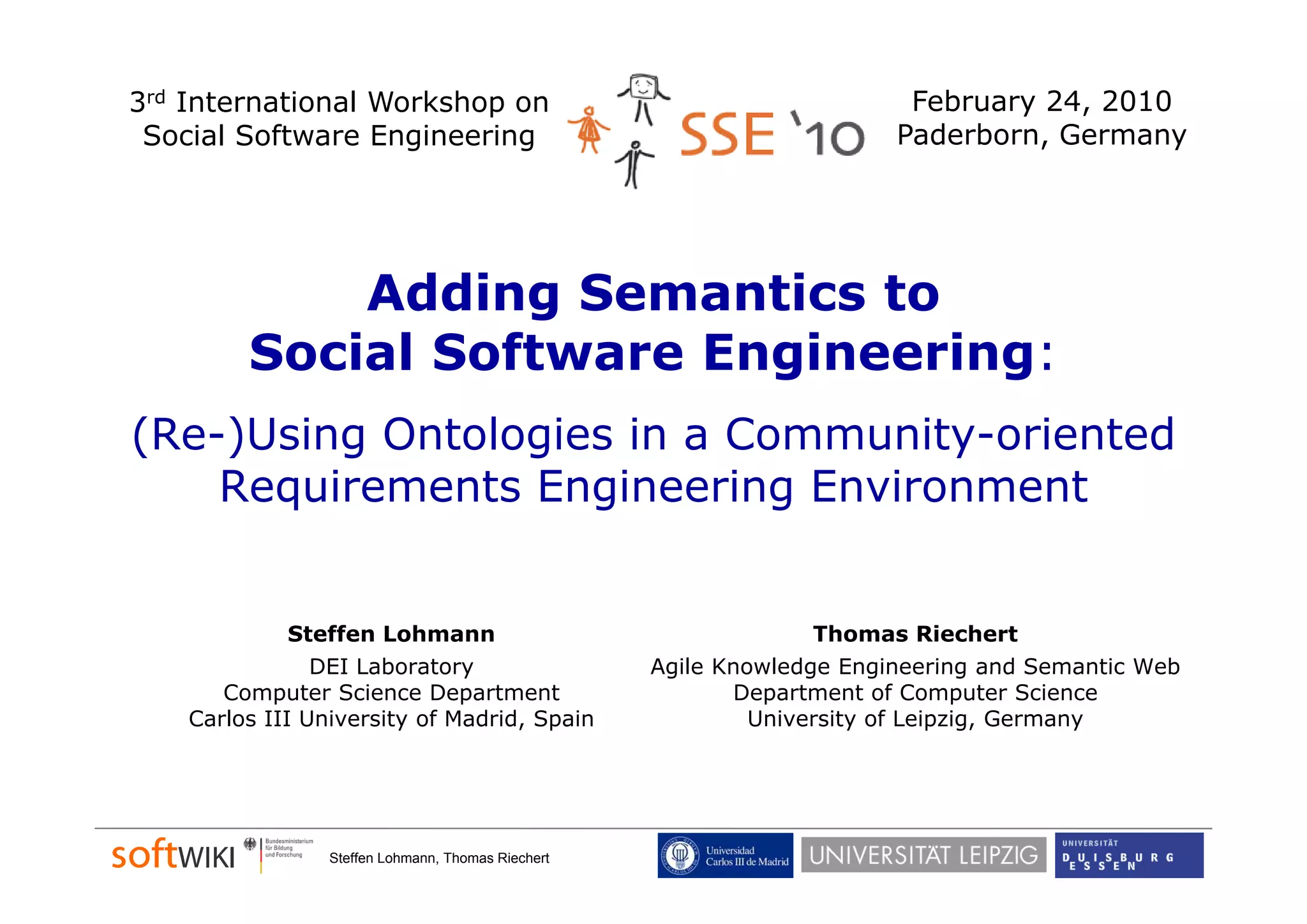 The document discusses the role of social software engineering (SSE) and the integration of ontologies to enhance community-oriented requirements engineering. It emphasizes the importance of reusing existing basic ontologies from the semantic web, such as Dublin Core and SKOS, to improve interoperability and collaboration in online environments. Future work includes addressing limitations in current ontologies and extending the SWORE upper ontology for better representation of software engineering aspects.
