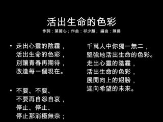 这篇文档探讨了如何活出生命的色彩以及生命的意义。通过引用歌曲歌词、经典诗句和宗教信仰,强调了在逆境中积极生活的重要性,并呼吁人们珍惜现有的每一天。文中还提到了人生的短暂以及对永恒的追求。