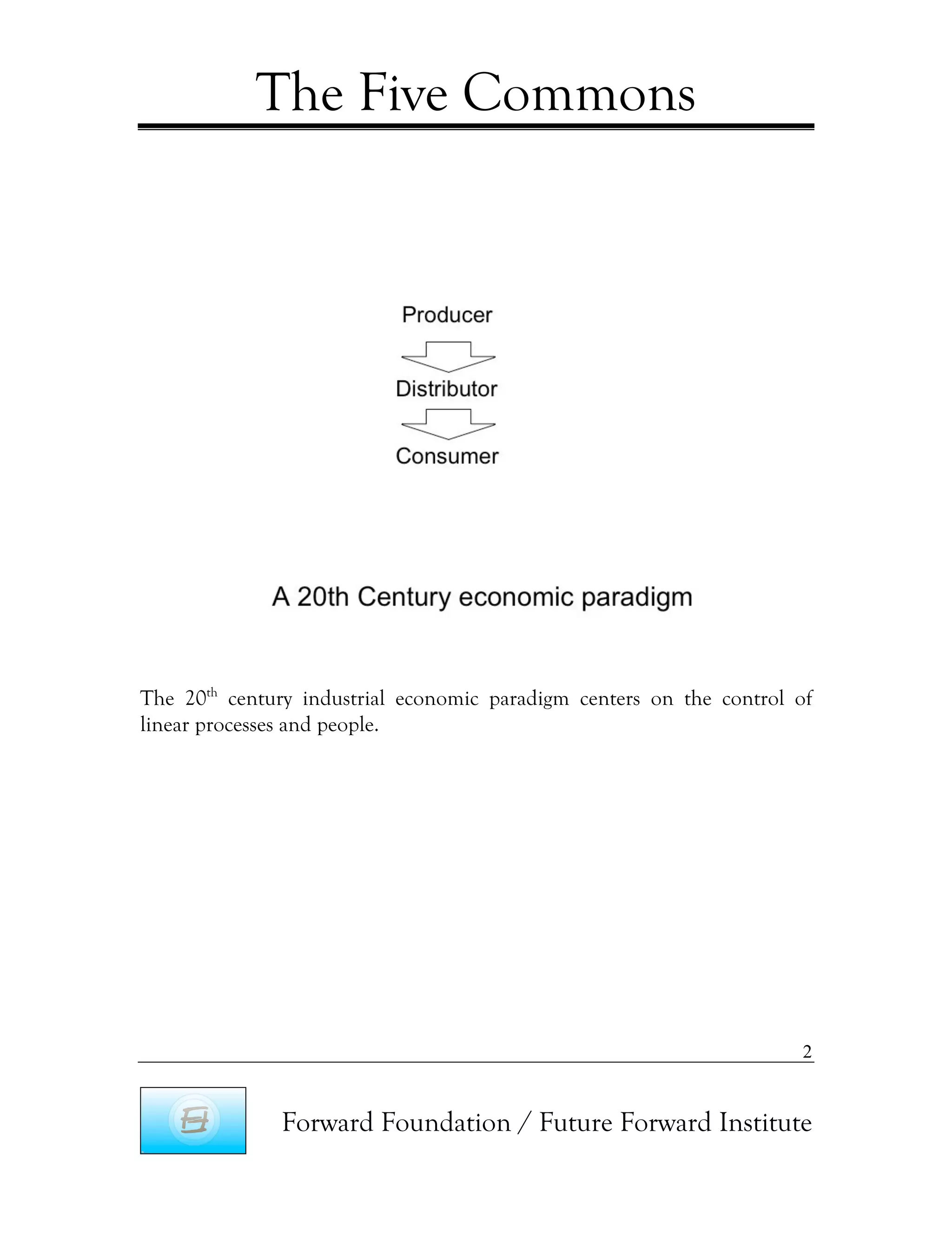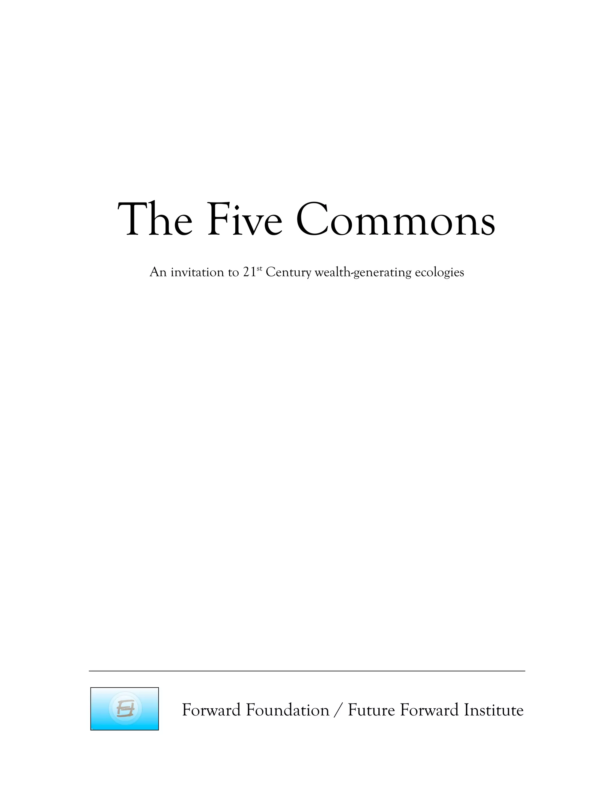 The document introduces the concept of "The Five Commons" as a new economic paradigm for the 21st century. It argues that current economic models focus too much on linear processes and static roles, whereas the Five Commons model encourages distributed, non-linear activities like making, using, and sharing physical and digital resources. The Five Commons framework identifies Food, Energy, Things, Culture, and Access as five areas that, through collaborative participation, can meet human needs in a sustainable way.