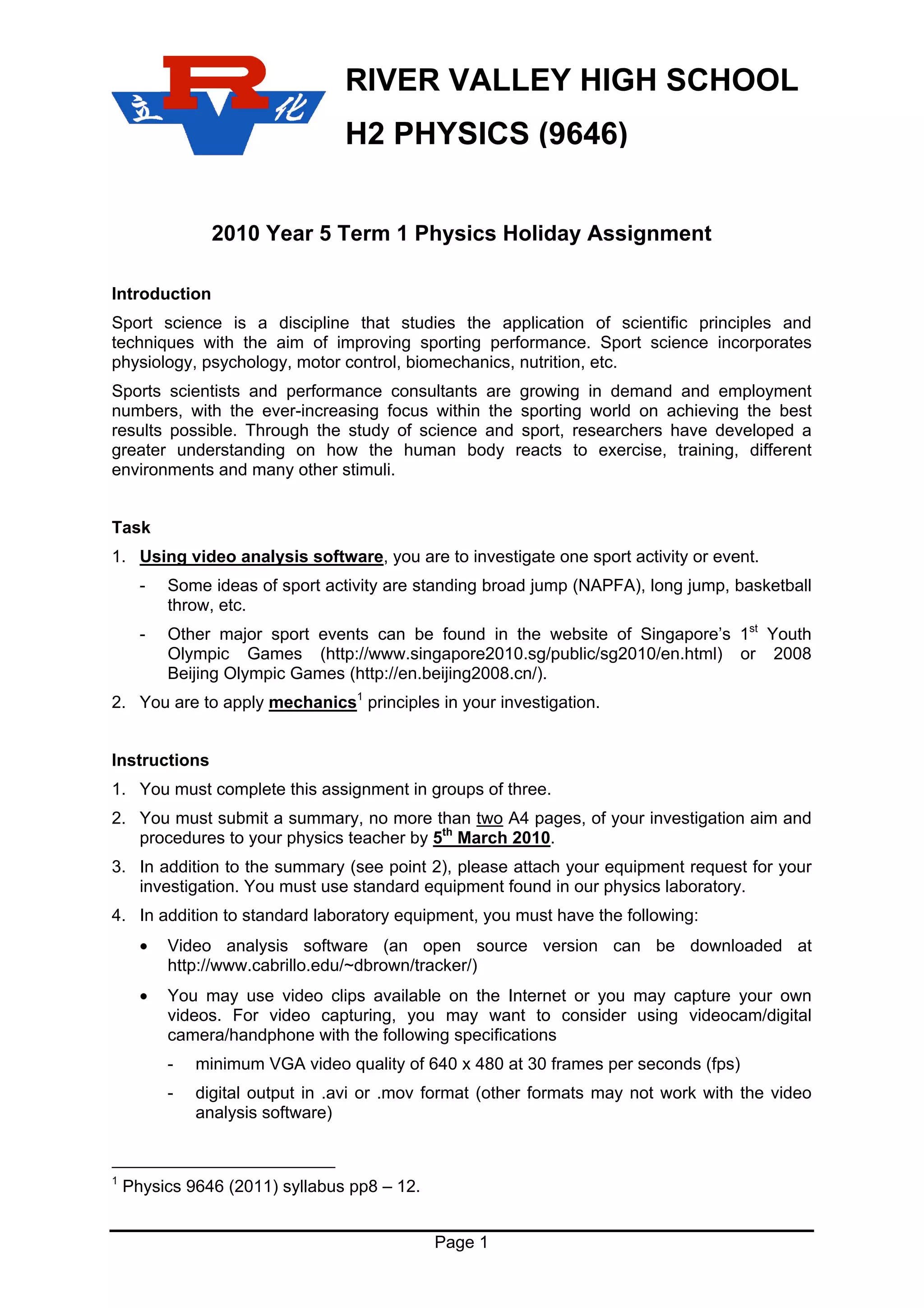This document provides instructions for a physics holiday assignment involving investigating a sport activity using video analysis software. Students are asked to: