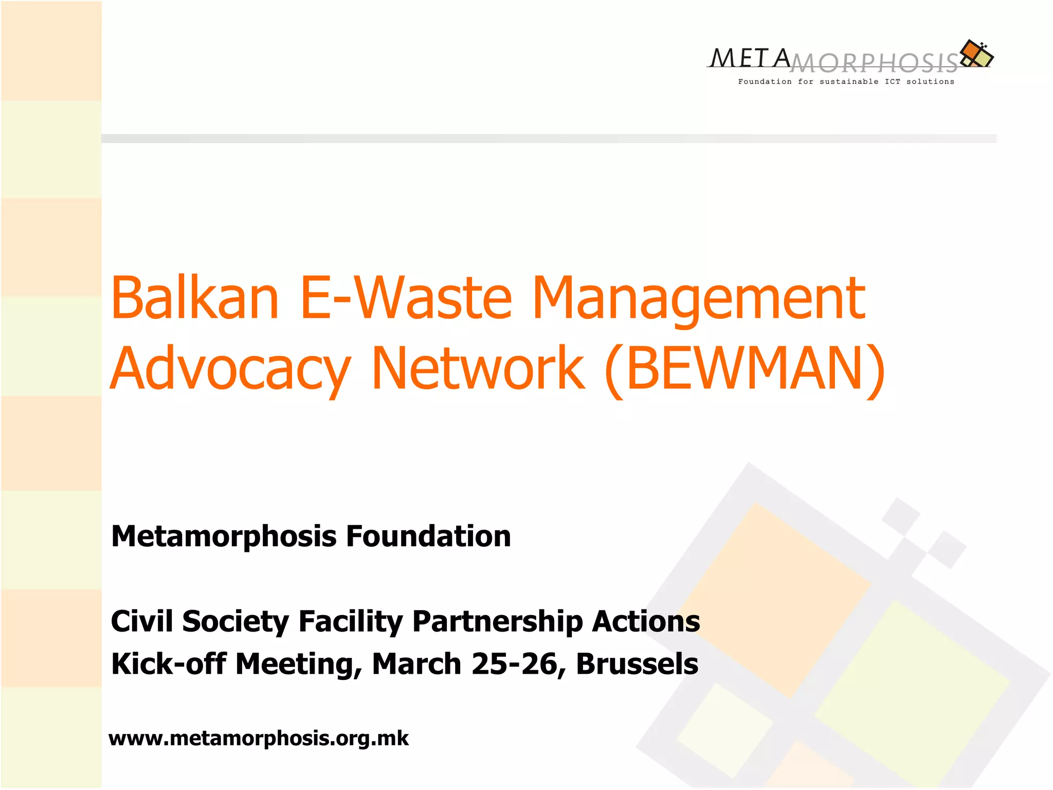 The Balkan E-Waste Management Advocacy Network (BEWMAN) project aims to improve e-waste management in Macedonia, Serbia, Croatia and Bulgaria. The project will develop a regional network for knowledge sharing on e-waste practices between CSOs in the four countries. It will build CSO capacity for advocacy and raise public awareness on proper e-waste disposal. Key activities include training, workshops, and public events to engage governments, businesses, media and citizens on developing effective e-waste policies and management standards in the Balkan countries.