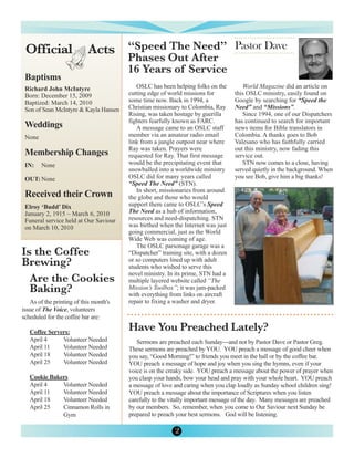 This document is an issue of a church newsletter from Our Saviour Lutheran Church in Green Bay, Wisconsin. It contains several articles on maintaining a healthy soul through worship and fellowship, a history of the church's "Speed The Need" missions ministry, announcements of upcoming classes and Bible studies, and a donation request list. The main article discusses how maintaining one's soul through worship, prayer, communion, and fellowship is analogous to maintaining a vehicle through regular care such as checking fluids and getting fuel. It says that without spiritual maintenance, one risks losing joy, faith, and ultimately salvation.