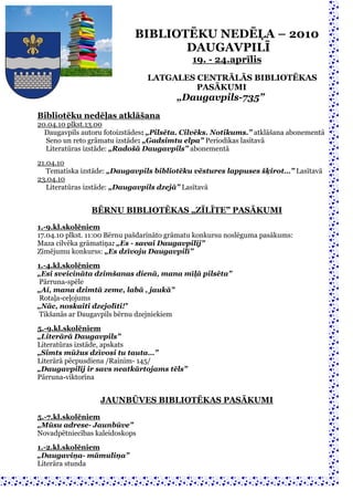2010 DAUGAVPILĪ 19. - 24.aprīlis LATGALES CENTRĀLĀS BIBLIOTĒKAS PASĀKUMI „Daugavpils-735” Bibliotēku nedēļas atklāšana 20.04.10 plkst.13.00 Daugavpils autoru fotoizstādes: „Pilsēta. Cilvēks. Notikums.” atklāšana abonementā Seno un reto grāmatu izstāde: „Gadsimtu elpa” Periodikas lasītavā Literatūras izstāde: „Radošā Daugavpils” abonementā 21.04.10 Tematiska izstāde: „Daugavpils bibliotēku vēstures lappuses šķirot…” Lasītavā 23.04.10 Literatūras izstāde: „Daugavpils dzejā” Lasītavā BĒRNU BIBLIOTĒKAS „ZĪLĪTE” PASĀKUMI 1.-9.kl.skolēniem 17.04.10 plkst. 11:00 Bērnu pašdarināto grāmatu konkursu noslēguma pasākums: Maza cilvēka grāmatiņa: „Es - savai Daugavpilij” Zīmējumu konkurss: „Es dzīvoju Daugavpilī” 1.-4.kl.skolēniem „Esi sveicināta dzimšanas dienā, mana mīļā pilsēta” Pārruna-spēle „Ai, mana dzimtā zeme, labā , jaukā” Rotaļa-ceļojums „Nāc, noskaiti dzejolīti!” Tikšanās ar Daugavpils bērnu dzejniekiem 5.-9.kl.skolēniem „Literārā Daugavpils” Literatūras izstāde, apskats „Simts mūžus dzīvosi tu tauta…” Literārā pēcpusdiena /Rainim- 145/ „Daugavpilij ir savs neatkārtojams tēls” Pārruna-viktorīna JAUNBŪVES BIBLIOTĒKAS PASĀKUMI 5.-7.kl.skolēniem „Mūsu adrese- Jaunbūve” Novadpētniecības kaleidoskops 1.-2.kl.skolēniem „Daugaviņa- māmuliņa” Literāra stunda CERIŅU BIBLIOTĒKAS PASĀKUMI