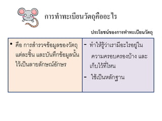 การทำทะเีบียนวัตถุ เป็นการสำรวจและจดบันทึกข้อมูลด้านต่างๆ ของวัตถุแต่ละชิ้นไว้เป็นลายลักษณ์อักษร อย่างน้อย ทำให้เรารู้ว่า วัตถุที่อยู่ในครอบครองมีจำนวนเท่าไหร่ มีอะไรบ้าง รูปร่างหน้าตาเป็นอย่างไร จัดเก็บที่ไหน และยังใช้เป็นหลักฐานอ้างอิง แสดงความเป็นเจ้าของ หากวัตถุชิ้นนั้นเกิดสูญหายหรือถูกขโมย