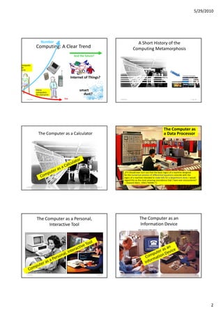 This document discusses the history and future of ubiquitous computing. It describes how computing has evolved from large mainframe computers used by many people to personal computers for individuals to many small computers everywhere for everything. Emerging technologies like embedded processors, wireless connectivity, new materials, improved sensors and localization will enable smart objects to cooperate and form an Internet of Things. Ubiquitous computing promises exciting applications but also presents challenges in infrastructure, usability, security and privacy that must be addressed.