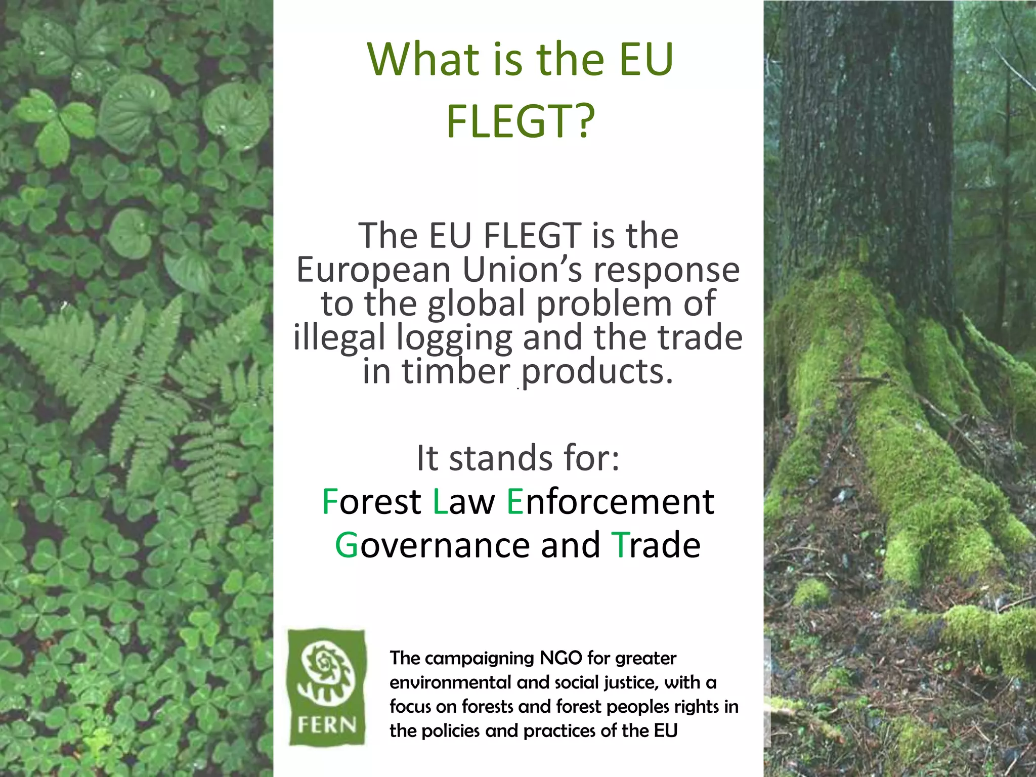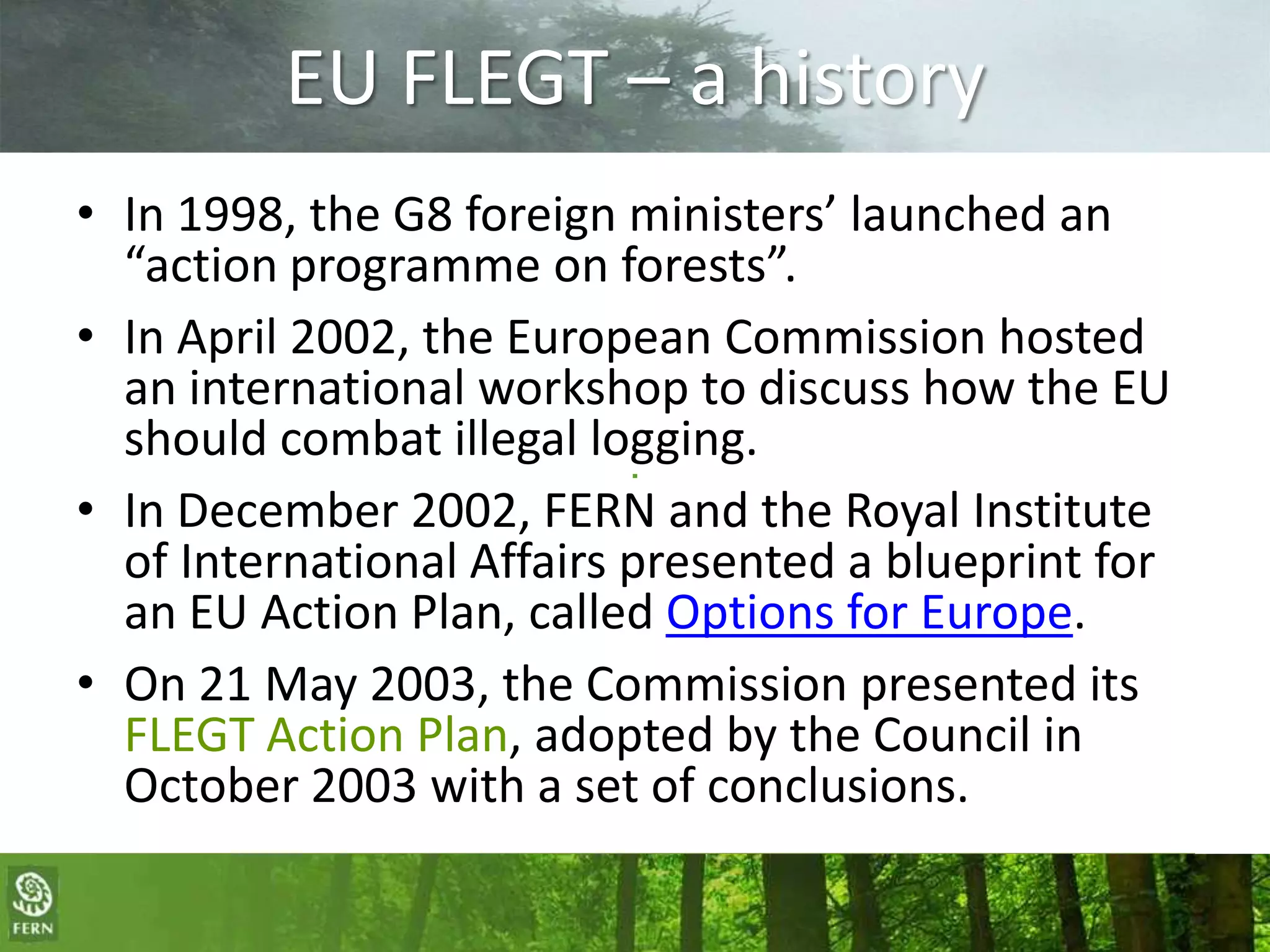 The EU FLEGT Action Plan aims to curb illegal logging by promoting sustainable and legal timber trade between the EU and producer countries. It establishes Voluntary Partnership Agreements (VPAs) that require producer countries to demonstrate legally-sourced timber using a Legality Assurance System that tracks timber sources. The plan also encourages sustainable procurement policies and regulates illegally sourced timber imports into the EU through the EU Timber Regulation.