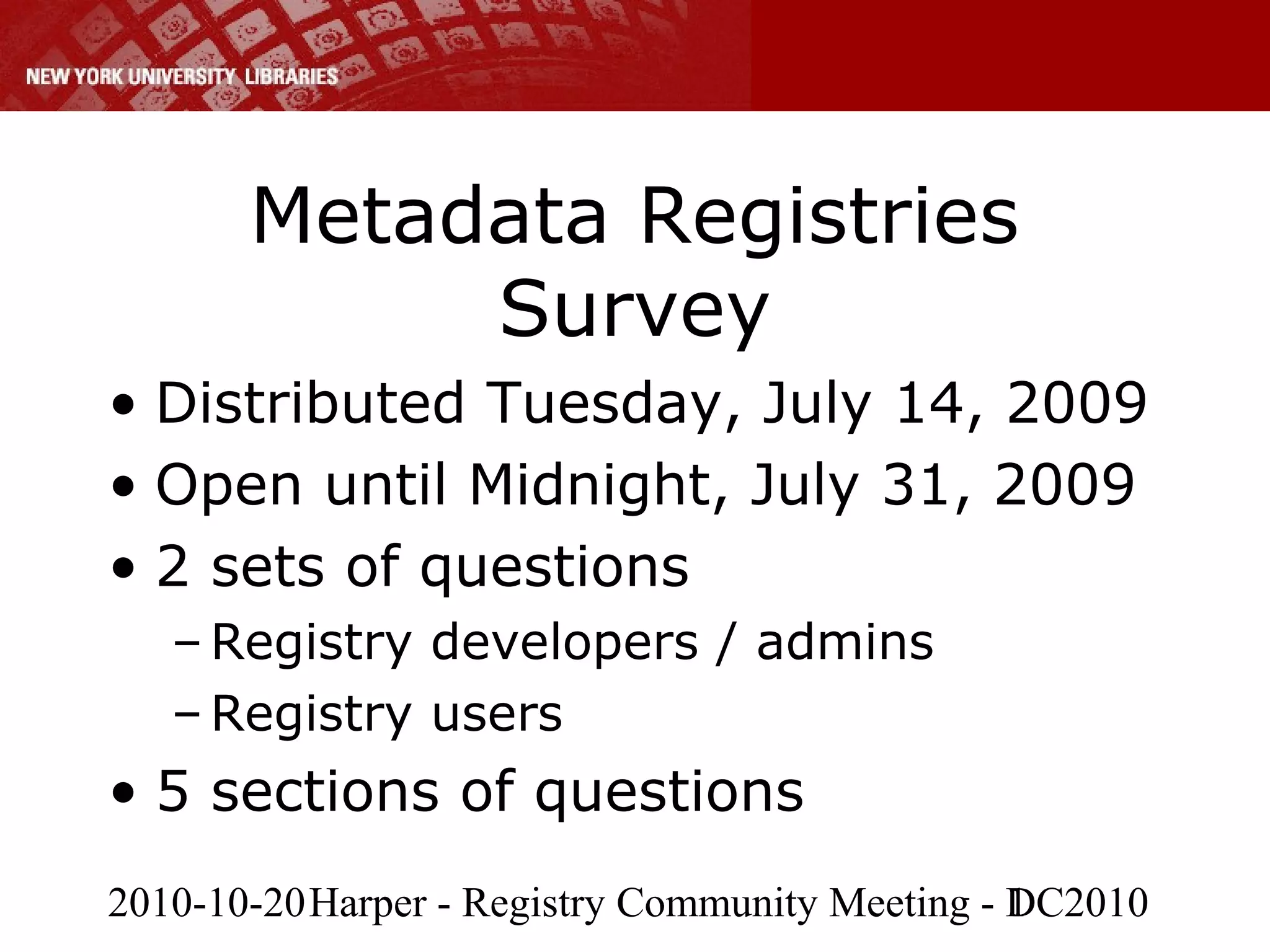 A survey was conducted of metadata registry developers and users from July to August 2009. Preliminary results were from 35 completed responses and 12 represented registry administrators. The survey addressed general information, registry contents, technical details, policies, and interoperability. Most registries contained controlled vocabularies and metadata terms, though few supported features like exporting data, harvesting content, or linked data. Next steps identified were improving interoperability through publishing registry changes as RSS feeds and enabling content negotiation and linked data in more registries. Further analysis of the survey responses was suggested.