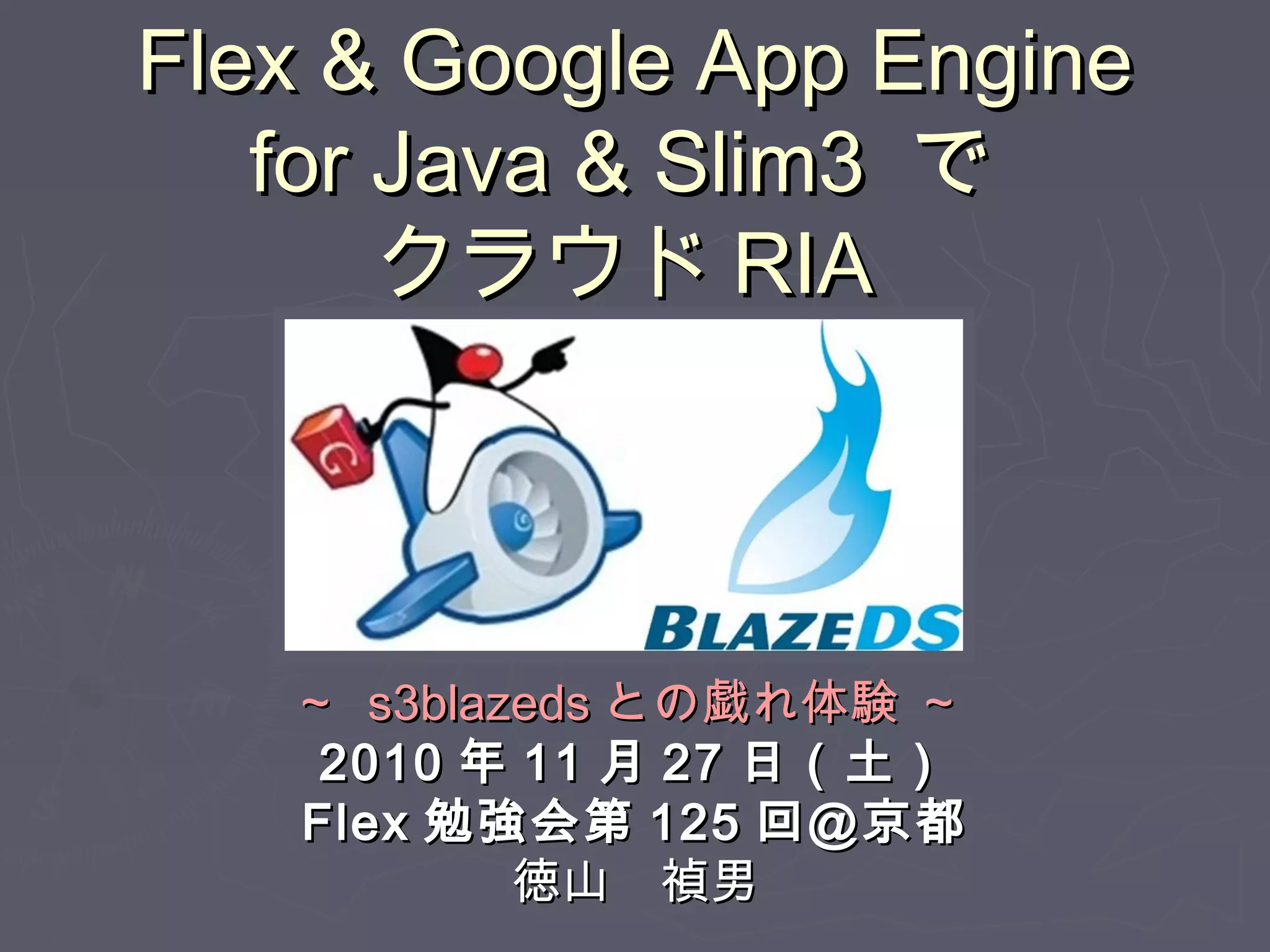 2010年11月27日土曜日に開催したlexUserGroup勉強会 第125回 15:15~15:45:「Flex & Google App Engine for Java & Slim3 で クラウドRIA ~ s3blazedsとの戯れ体験 ~」by http://twitter.com/tokufxug