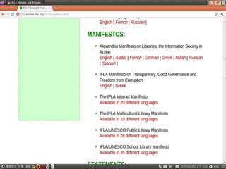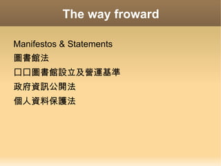 文档讨论了图书馆与自由软件的共同理念,强调自由、平等和博爱的价值。还提到高等教育中的自由软件应用和一些重要法令,如图书馆法、政府信息公开法等。最后,文档探讨了实现这些理想的途径。