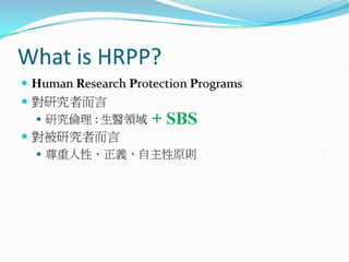 2011年11月25日專題演講 – 人類行為研究倫理與人體研究倫理治理架構建置計畫by謝淑蘭老師 PPTX
