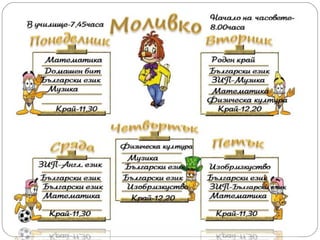 Разписание на часовете1час 8.00 – 8.40 2час 8.50 – 9.30 голямо междучасие 3час 10.00 – 10.40 4час 10.50 – 11.30 5 час 11.40 – 12.20