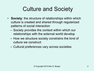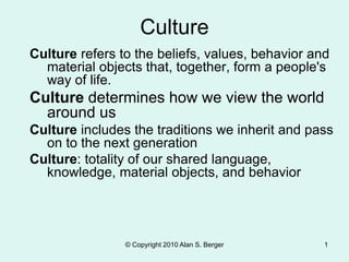This document discusses key concepts related to culture. It defines culture as the beliefs, values, and ways of life shared by a group of people. Culture is learned and includes both material and non-material aspects. Society provides the context for culture and influences how culture develops. While culture varies across societies, there are also common components of culture like symbols, language, values, norms, and material objects. The document examines theories for analyzing culture and discusses factors like globalization, technology, and diversity that influence cultural change.
