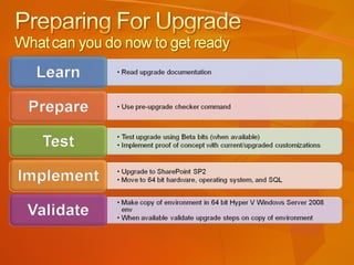 Joel Oleson is an experienced SharePoint architect who provides recommendations for preparing a SharePoint environment for an upgrade. He recommends using tools like PreUpgradeCheck to identify issues, cleaning up unused objects and data, and testing the upgrade process on a copy of the production environment before performing the actual upgrade. Proper planning, testing custom solutions, and addressing any issues found are important to a successful upgrade.