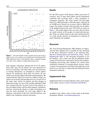 3) Analysis of the database shows that over time, TMS treatment has involved delivering more pulses per day, with a range of 30 to 3600 pulses daily across studies. Total pulses delivered over a study ranges from 30 to 150,000.