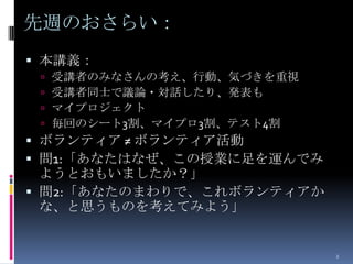 受講者のみなさんの考え、行動、気づきを重視 受講者同士で議論・対話したり、発表も マイプロジェクト 毎回のシート3割、マイプロ3割、テスト4割 ボランティア ≠ ボランティア活動 問1:「あなたはなぜ、この授業に足を運んでみ ようとおもいましたか?」 問2:「あなたのまわりで、これボランティアか な、と思うものを考えてみよう」 2