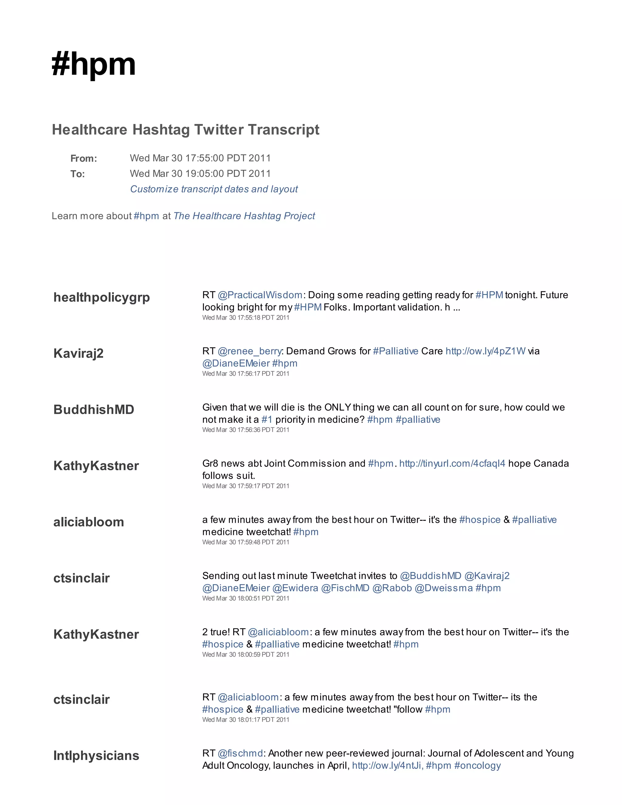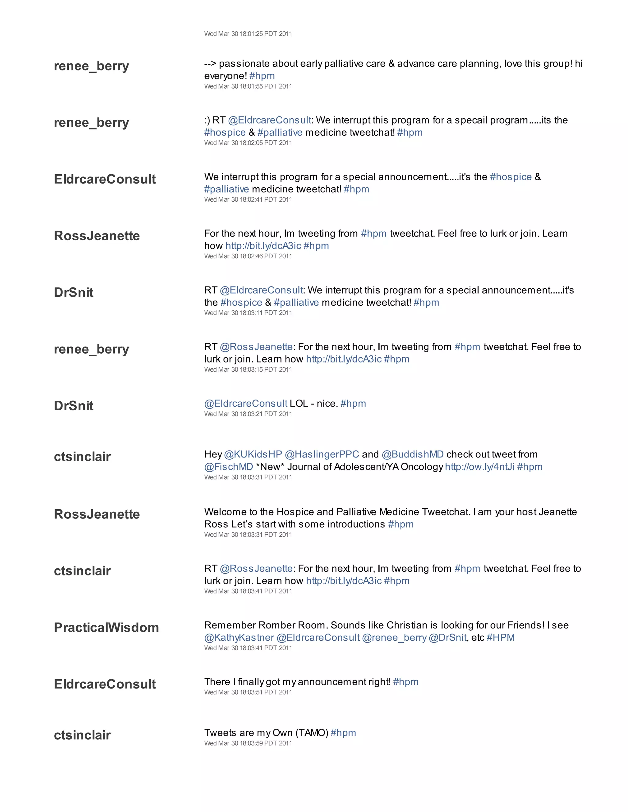 This document is a transcript of tweets from a #hpm (hospice and palliative medicine) tweetchat that took place on March 30, 2011 from 5:00-6:00pm PDT. Participants introduced themselves and discussed unique issues in caring for patients with dementia, including difficulty determining pain/discomfort and explaining functional decline given limitations of assessment scales. The chat focused on sharing knowledge and experience in hospice and palliative care.