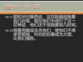 摩西向耶和华为以色列百姓求情,尽管他们藐视神,但耶和华决定赦免他们的罪。耶和华警告这些人不能进入应许之地,只有迦勒因其心志与神同在,将被带入那地。神的同在被视为给予信徒的最大礼物,强调在艰难时刻对神的信任和依靠。