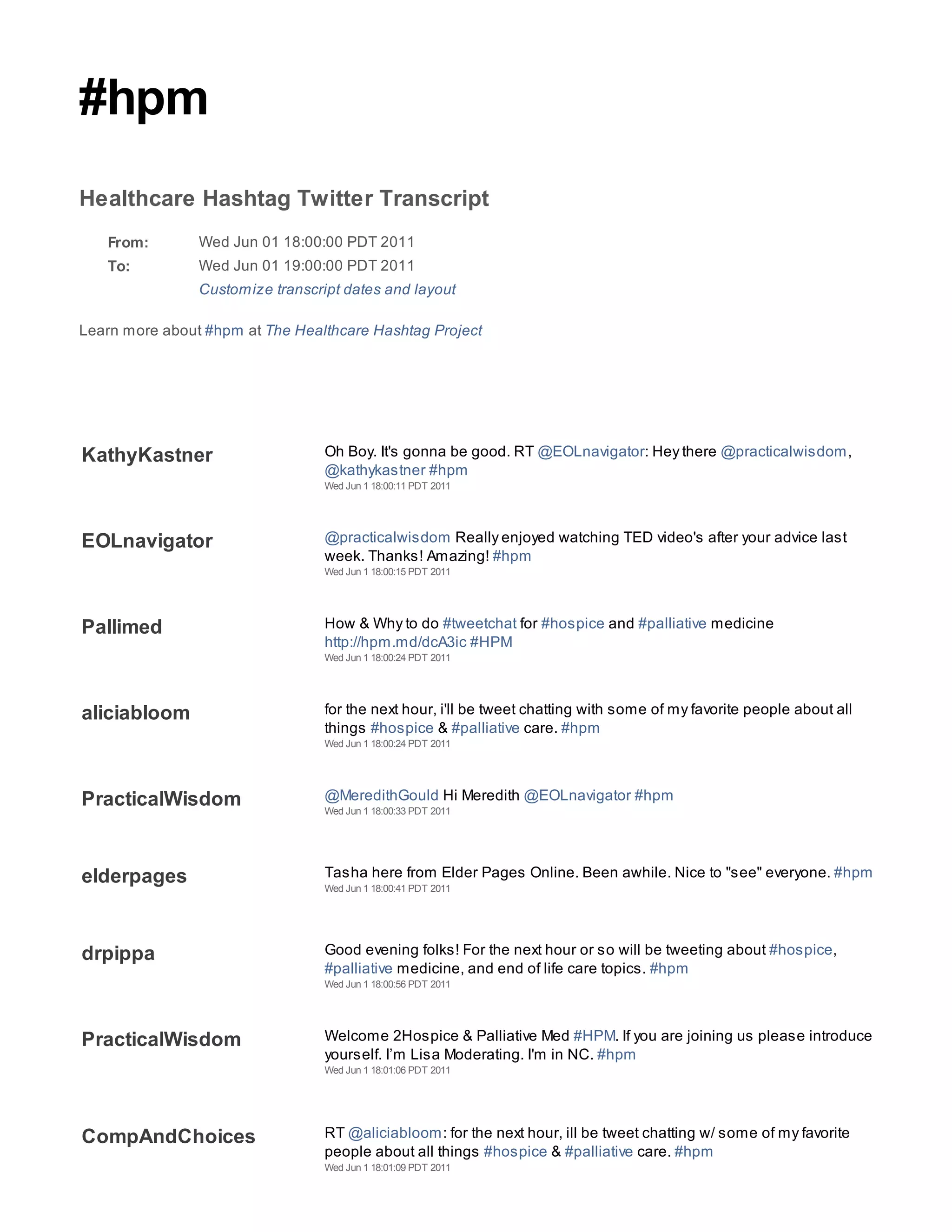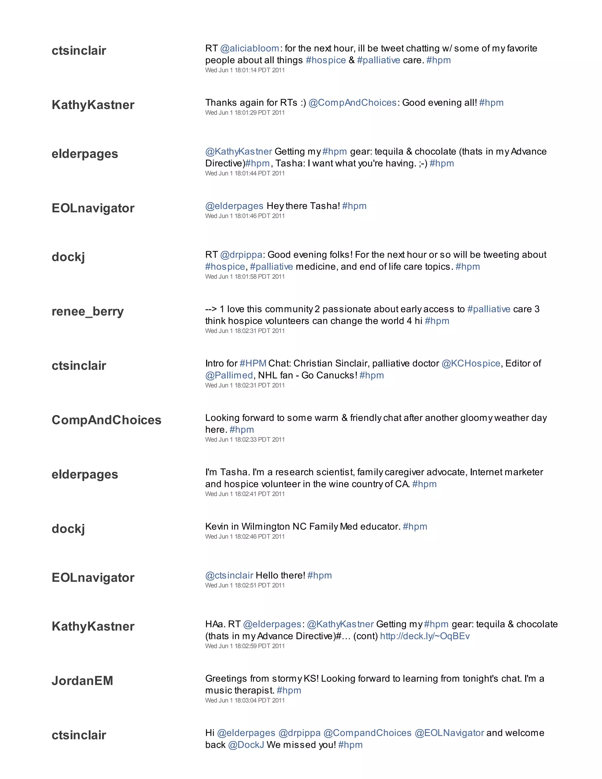 This document is a transcript of tweets from a one hour Twitter chat about hospice and palliative medicine using the hashtag #hpm. Various healthcare professionals from across the US introduced themselves and shared where they are located. They discussed storms in some areas and prayed for those affected. The chat also touched on what happens to people's social media accounts after they die.