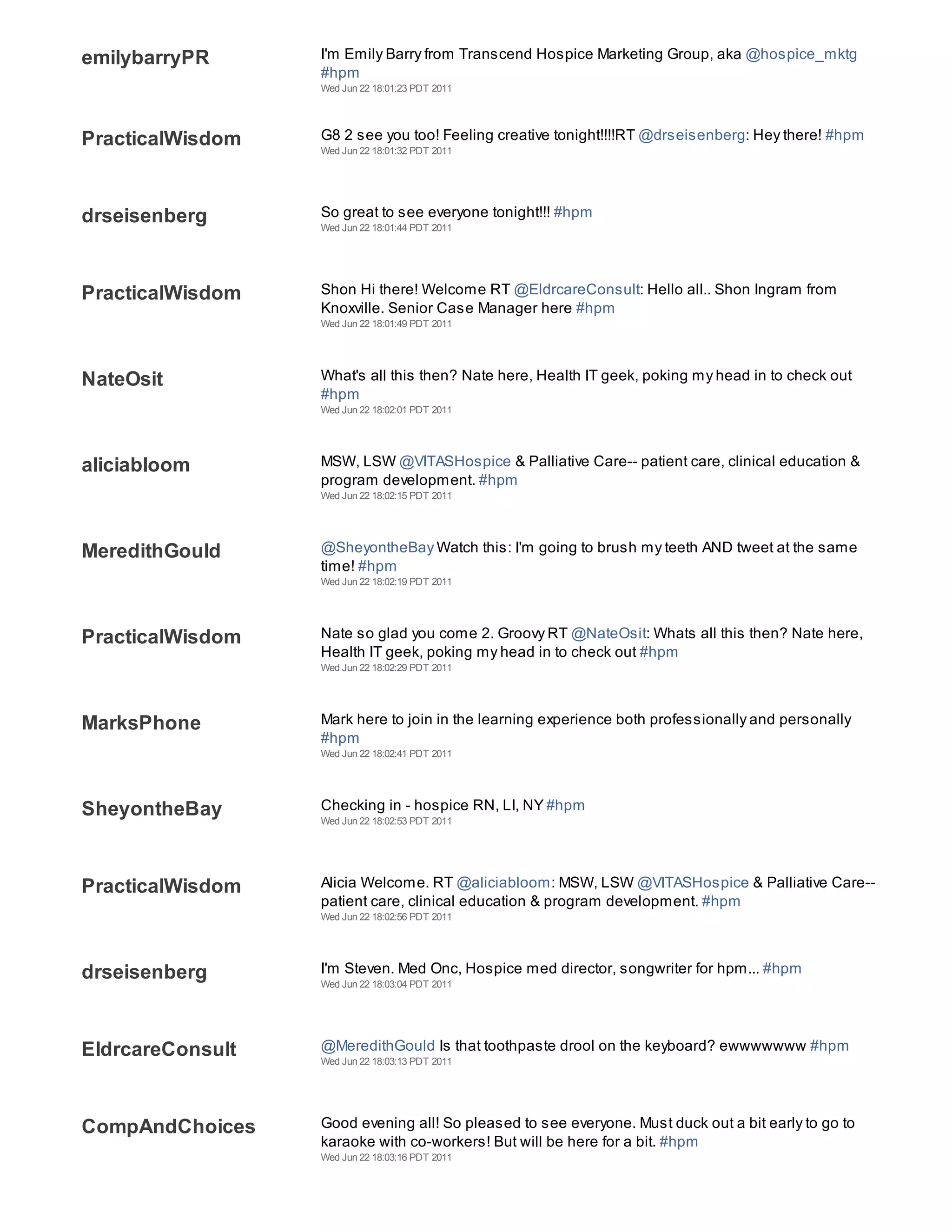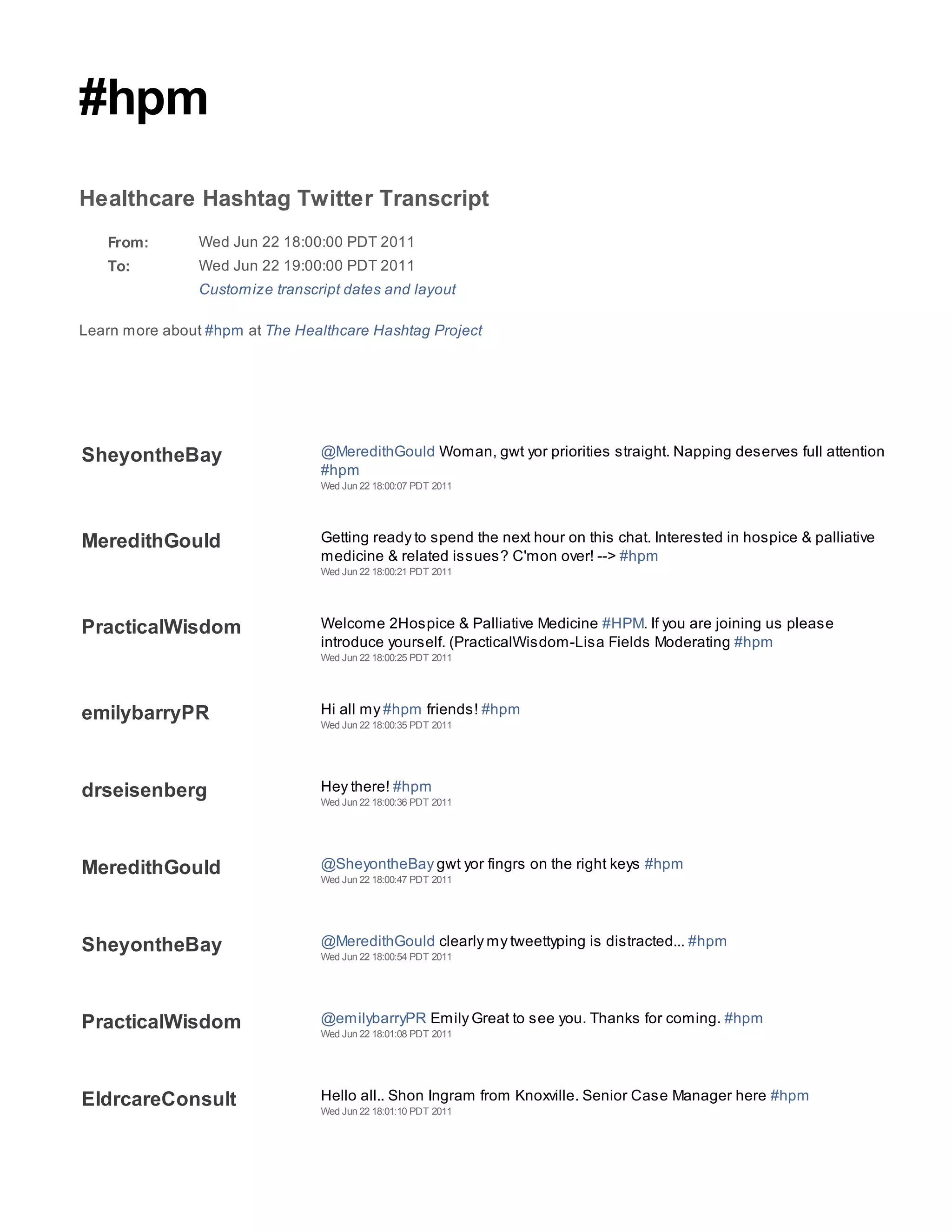 This document is a transcript of a Twitter chat about hospice and palliative medicine (#hpm) that took place on June 22, 2011 from 6:00-7:00pm PDT. Various medical professionals, caregivers, and others introduced themselves and shared perspectives on issues relating to hospice, palliative care, and end-of-life care. The participants discussed how design and creativity could help spread awareness of palliative care services.