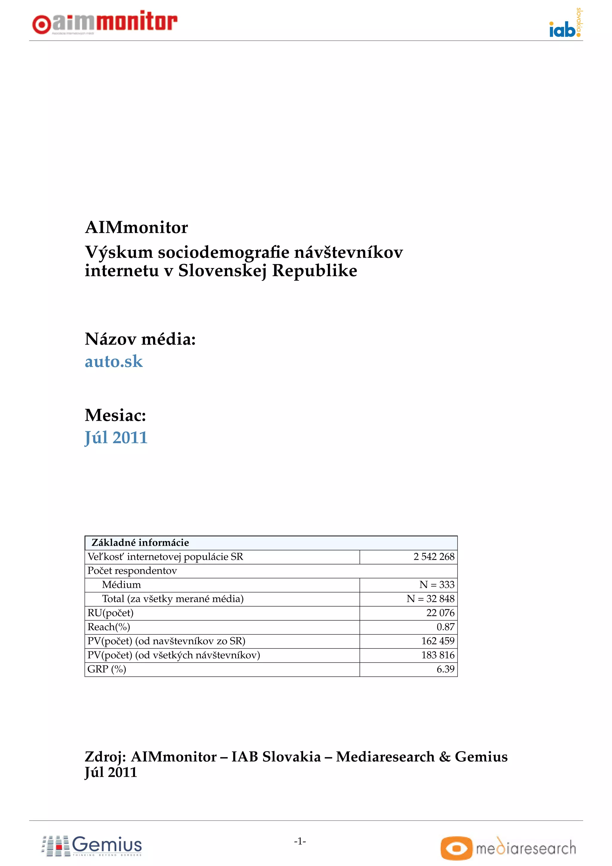 Zdroj: AIMmonitor – IAB Slovakia – Mediaresearch & Gemius, Júl 2011