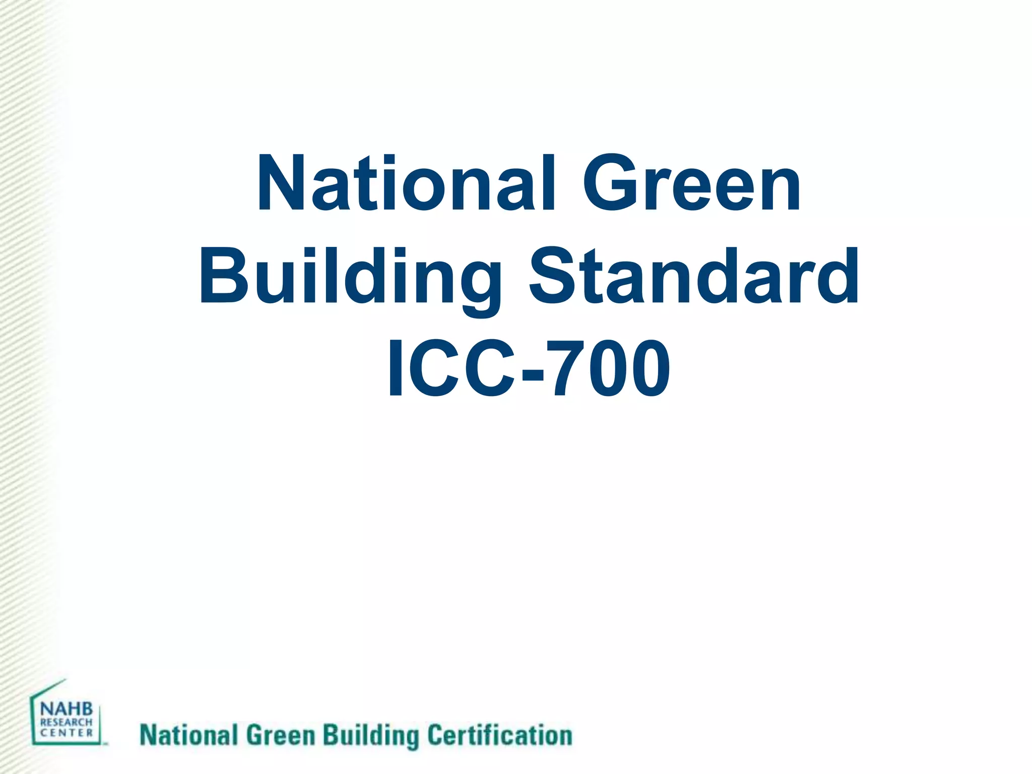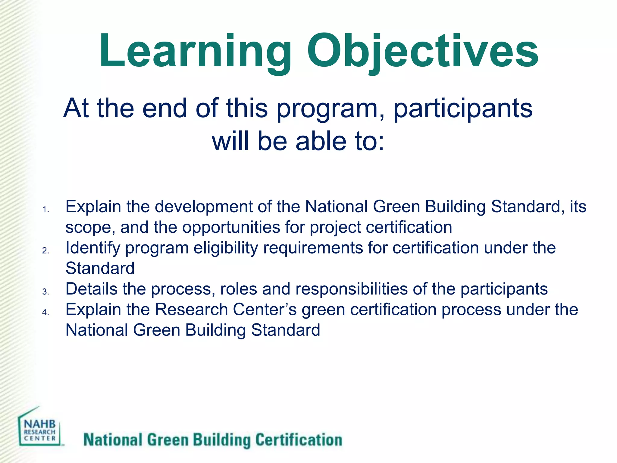The document provides an overview of the National Green Building Standard (NGBS) certification program. It discusses the development and scope of the NGBS, the certification process, costs, accredited verifiers, product approvals, incentives, and revisions. The certification ensures projects meet the consensus-based requirements in the NGBS across various residential building types and levels of certification.
