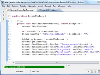 This document discusses techniques for practicing and improving programming skills. It recommends practicing test-driven development, pairing programming, refactoring with all tests passing, and continuous integration. It emphasizes practicing testing contracts and interfaces rather than behavior, and testing programs from the outside-in perspective. The document concludes by encouraging freeing the mind and practicing programming as an art.
