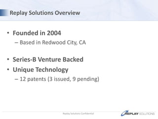 - Replay Solutions automates 30% of the software lifecycle using its patented ReplayDIRECTOR technology which records application executions at runtime with minimal overhead.