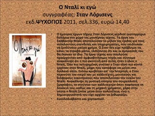 Ο Νταλί κιεγώ συγγραφέας: Σταν Λόρισενς εκδ. ΨΥΧΟΓΙΟΣ 2011, σελ.336, ευρώ 14,40 Ο έμπορος έργων τέχνης Σταν Λόρισενς κέρδισε εκατομμύρια δολάρια στο χώρο της μοντέρνας τέχνης. Τα έργα του Σαλβαντόρ Νταλί αποτελούσαν το μήλον της έριδος για τους νεόπλουτους επενδυτές και επιχειρηματίες, που επιδίωκαν να ξεπλύνουν μαύρο χρήμα. Ο Σταν δεν είχε πρόβλημα να κάνει τα στραβά μάτια, ελπίζοντας ότι και οι αγοραστές του θα έκαναν το ίδιο. Τα έργα τέχνης που πουλούσε προέρχονταν από αμφισβητήσιμες πηγές και σύντομα ανακάλυψε ότι η πιο σκοτεινή από αυτές ήταν ο ίδιος ο Νταλί. Όσο πιο πετυχημένος γινόταν ο Σταν τόσο πιο κοντά ερχόταν στον Νταλί, μέχρι που κατάφερε να μείνει στο διπλανό σπίτι. Ενόσω κρυβόταν απ’ την Ίντερπολ, ο Σταν περνούσε τον καιρό του με καλλιτέχνες, μουσικούς και διάφορους εκκεντρικούς που αποτελούσαν τον κύκλο του Νταλί. Ανακάλυψε τη μυστική ιστορία του σουρεαλιστή ζωγράφου, το στούντιο των καλλιτεχνών όπου παρήγαγε τη δουλειά του, καθώς και τη μηχανή χρήματος, χάρη στην οποία ο Νταλί ζούσε μέσα στην πολυτέλεια, ενώ η δημιουργικότητά του είχε αρχίσει να ξεθωριάζει. Ευκολοδιάβαστο και χορταστικό.