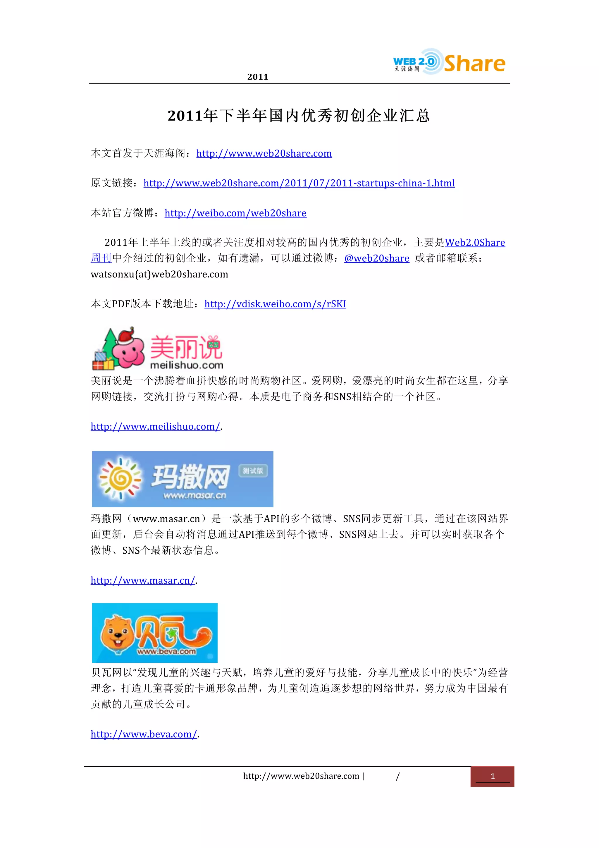 本文总结了2011年下半年国内一些优秀初创企业,包括美丽说、玛撒网、贝瓦网等,涵盖电商、社交、儿童教育等多个领域。这些初创企业通过结合新技术和用户需求,创造了创新的商业模式,推动了中国互联网的发展。还提及了一些移动互联网服务和社交平台的兴起,显示出市场的多样化趋势。