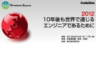 This document is a transcript from a lightning talk given by Hiromu Shioya from kwappa.net on January 17, 2012. It introduces Shioya and provides links to kwappa.net, information on job openings from Dwango, a slideshow presentation, and information on an upcoming developer conference. The talk concludes by thanking the audience for listening.