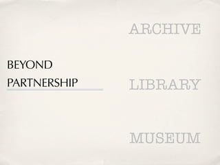 The document discusses the future of collaboration between institutions in a digital world, emphasizing the impact of digital technologies on public knowledge collections. It explores various topics such as the evolution of libraries and museums, the importance of understanding user needs, and the challenges of partnerships in a complex environment. Additionally, it presents a systems thinking approach to address these challenges and improve institutional practices.