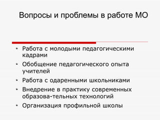 Документ обобщает деятельность по повышению квалификации педагогов и организации учебного процесса в школах поселка Агинское, включая работу с одаренными учащимися и внедрение современных образовательных технологий. Приведены статистические данные по результатам ЕГЭ за 2010 и 2011 годы, в том числе процент успешных сдач и средние баллы по биологии в различных школах. Также документ содержит информацию о проблемах, связанных с образовательным процессом, и направлениях работы с молодыми педагогами.