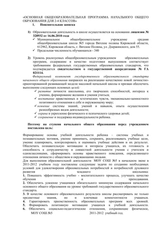 Документ содержит образовательную программу для начального общего образования в средней школе №5 города Вятские Поляны на 2011-2012 учебный год. Основное внимание уделяется реализации федеральных государственных образовательных стандартов, формированию личностно ориентированной модели обучения и обеспечению здоровья и развития учащихся. Программа включает различные предметы и модули, направленные на развитие ключевых компетенций и интереса к обучению.