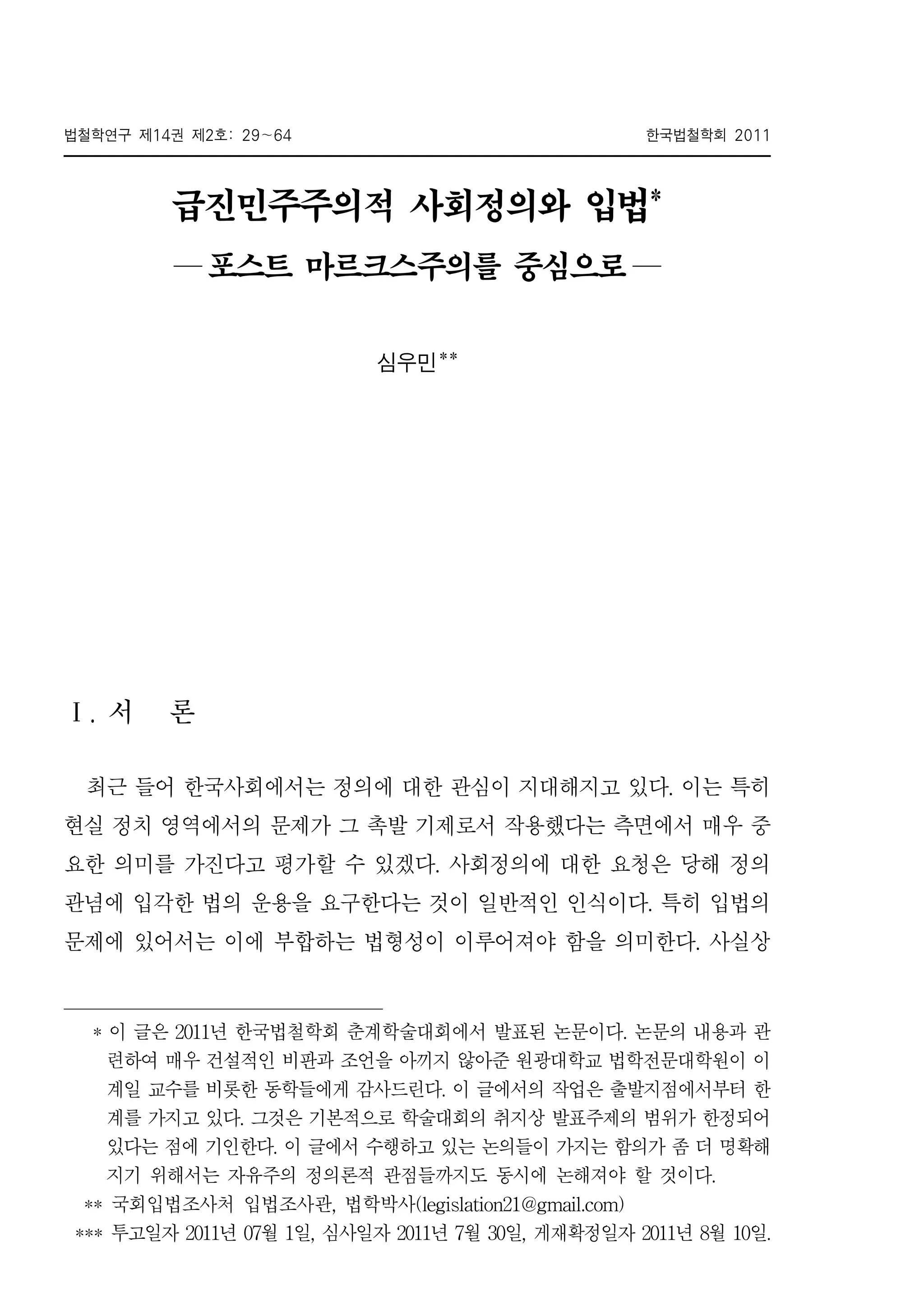 급진민주주의적 사회정의와 입법* 1)