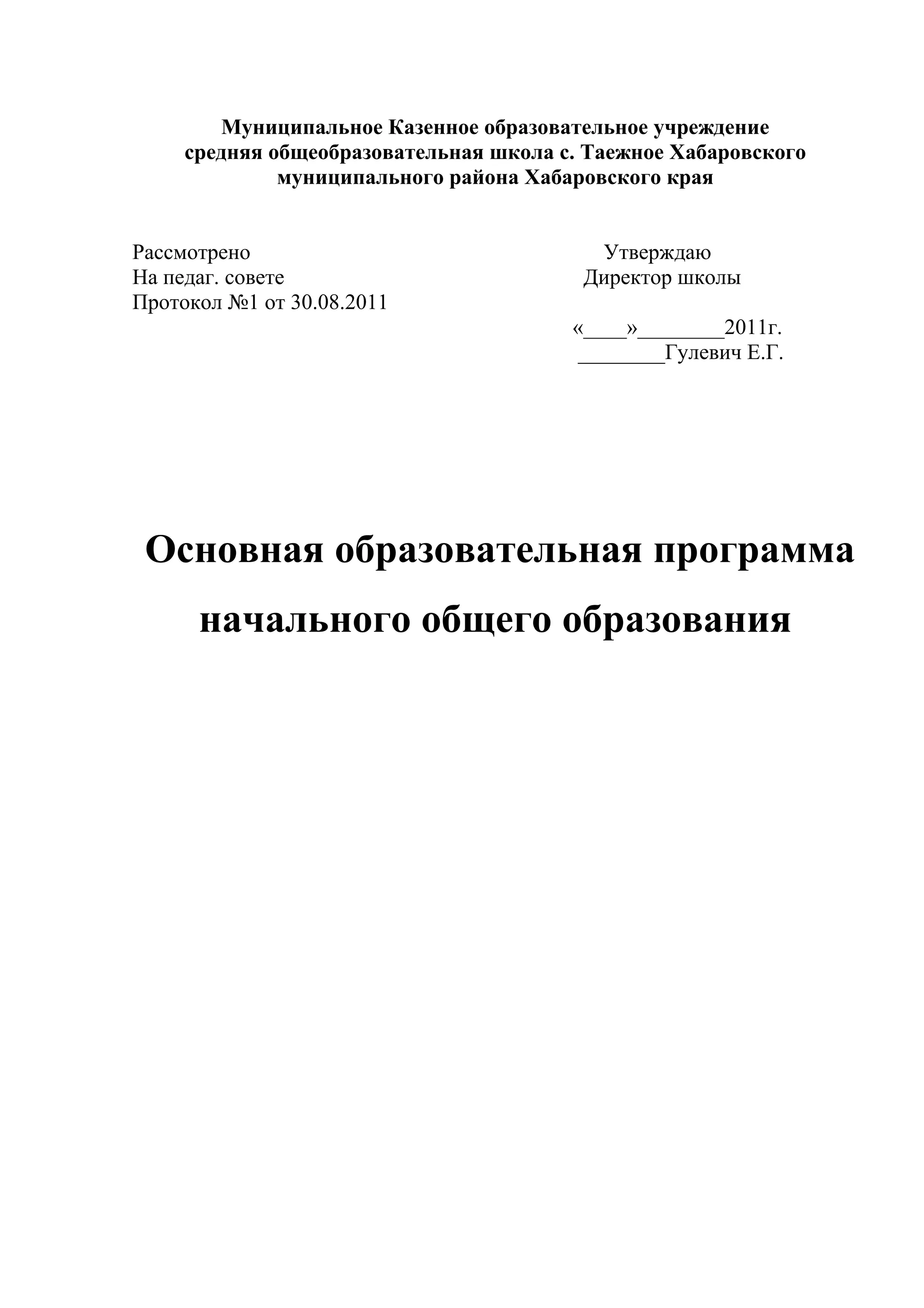 Документ представляет основную образовательную программу начального общего образования для средней общеобразовательной школы с. Таежное, утвержденную педагогическим советом. Программа направлена на всестороннее развитие учащихся, охватывая личностные, регулятивные, познавательные и коммуникативные универсальные учебные действия. Основное внимание уделяется формированию у детей навыков учёбы, социальной адаптации и духовно-нравственного воспитания.