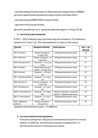 Доклад МБДОУ №22 г. Азова за 2011-2012 учебный год подводит итоги работы детского сада, описывая его историю, структуру, а также образовательный процесс. В учреждении обучалось 231 ребенок в возрасте от 1,5 до 7 лет, с акцентом на создание комфортной и развивающей среды. Также освещается взаимодействие с семьями воспитанников и внимание к вопросам безопасности и здоровья детей.