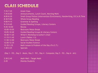 This document provides the schedule and curriculum overview for Mrs. Hawley's 2nd grade class. It outlines the daily schedule, including times for reading, writing, math, and specials. It also describes the behavior system, homework and grading policies, end-of-year promotion requirements, and ways for parents to contact the teacher. The purpose is to orient parents to the classroom routines and expectations for the school year.